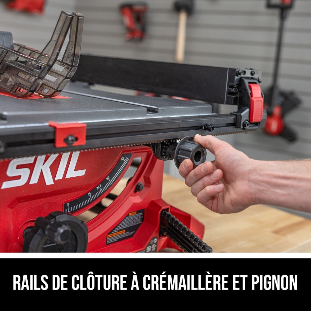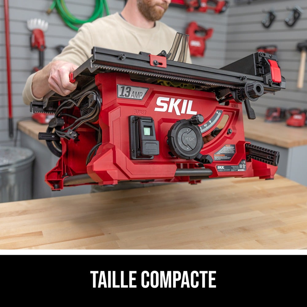 La scie à table compacte SKIL de 13 ampères, 8-1/4 po fournit la puissance nécessaire à toute une gamme d’applications et de coupes, que vous coupiez des planches de terrasse, que vous encadriez un mur dans le cadre d’une rénovation de sous-sol, que vous construisiez un bar, et bien plus encore. Découpez des feuilles de contreplaqué, réalisez des coupes transversales et des joints rainurés en toute confiance grâce aux rails du guide à pignon et crémaillère de la scie qui garantissent que le guide reste parallèle pour produire des coupes rapides, fines et précises. Sa taille compacte permet de la transporter et de la ranger facilement entre deux utilisations. La table en aluminium permet de réaliser des coupes de haute qualité, tandis que le coude de l’orifice de dépoussiérage redirige la poussière vers un conteneur afin de faciliter le nettoyage. L’alignement parallèle de la lame facilite le réglage de la lame le long du guide de refente et de la fente d’onglet, pour permettre d’effectuer des coupes précises. Un interrupteur de sécurité permet un arrêt immédiat pour assurer une sécurité accrue. La scie à table est livrée avec une jauge à onglets, un bâton poussoir, un système de protection modulaire, un guide, un cliquet antirebond, (2) clés de changement de lame et un coude pour l’évacuation de la poussière.