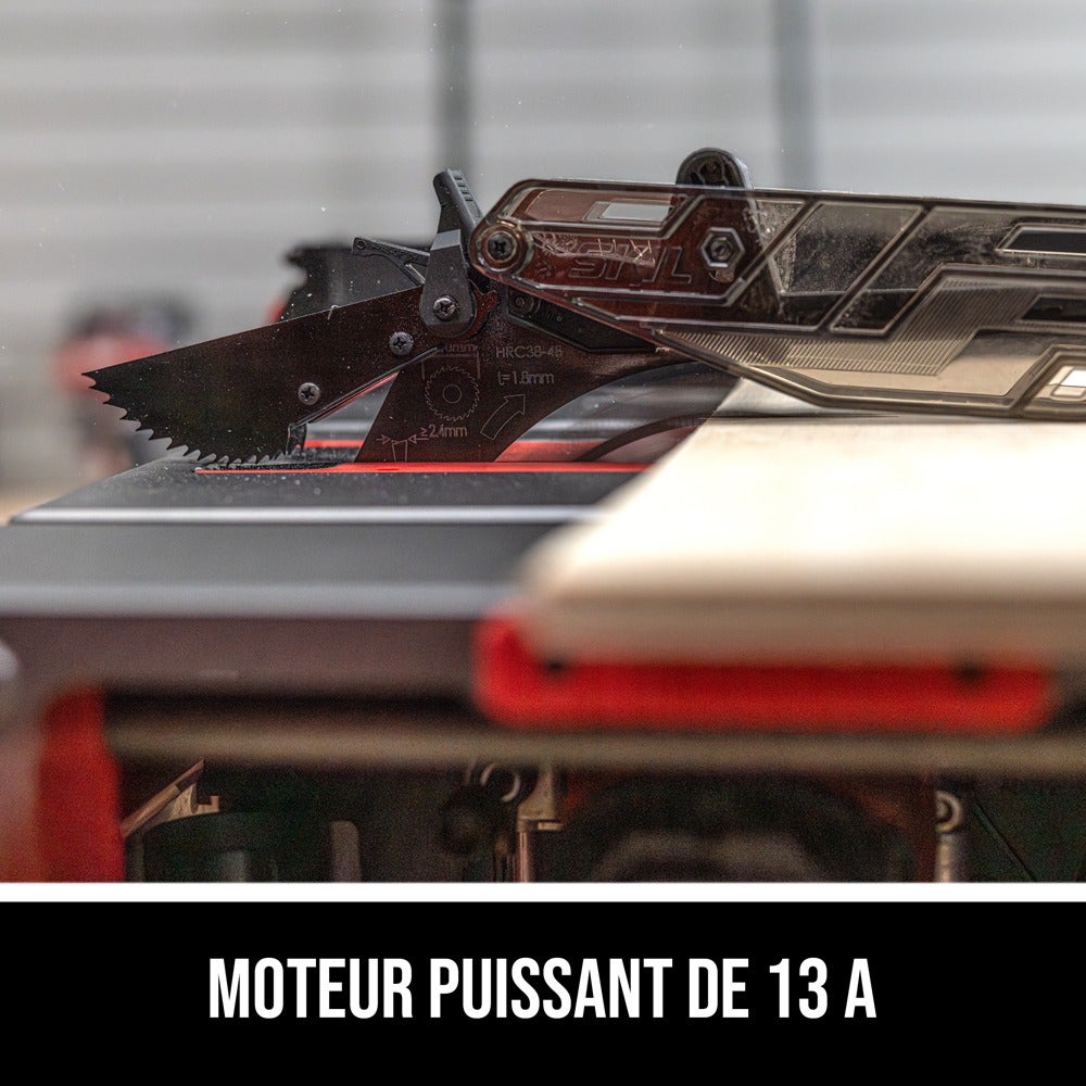 - MOTEUR PUISSANT DE 13 A - Puissance nécessaire pour de nombreuses applications, telles que le refendage de feuilles de contreplaqué, la coupe transversale de 5 x 10 cm pour l'encadrement, la découpe de joints à rainures, etc