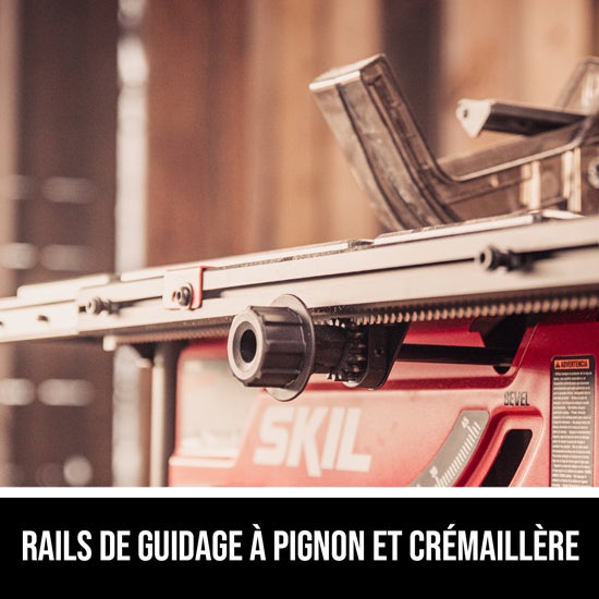 - RAILS DE GUIDAGE À CRÉMAILLÈRE – Ils assurent que le guide reste parallèle à la lame pour produire des coupes rapides, précises et fines.