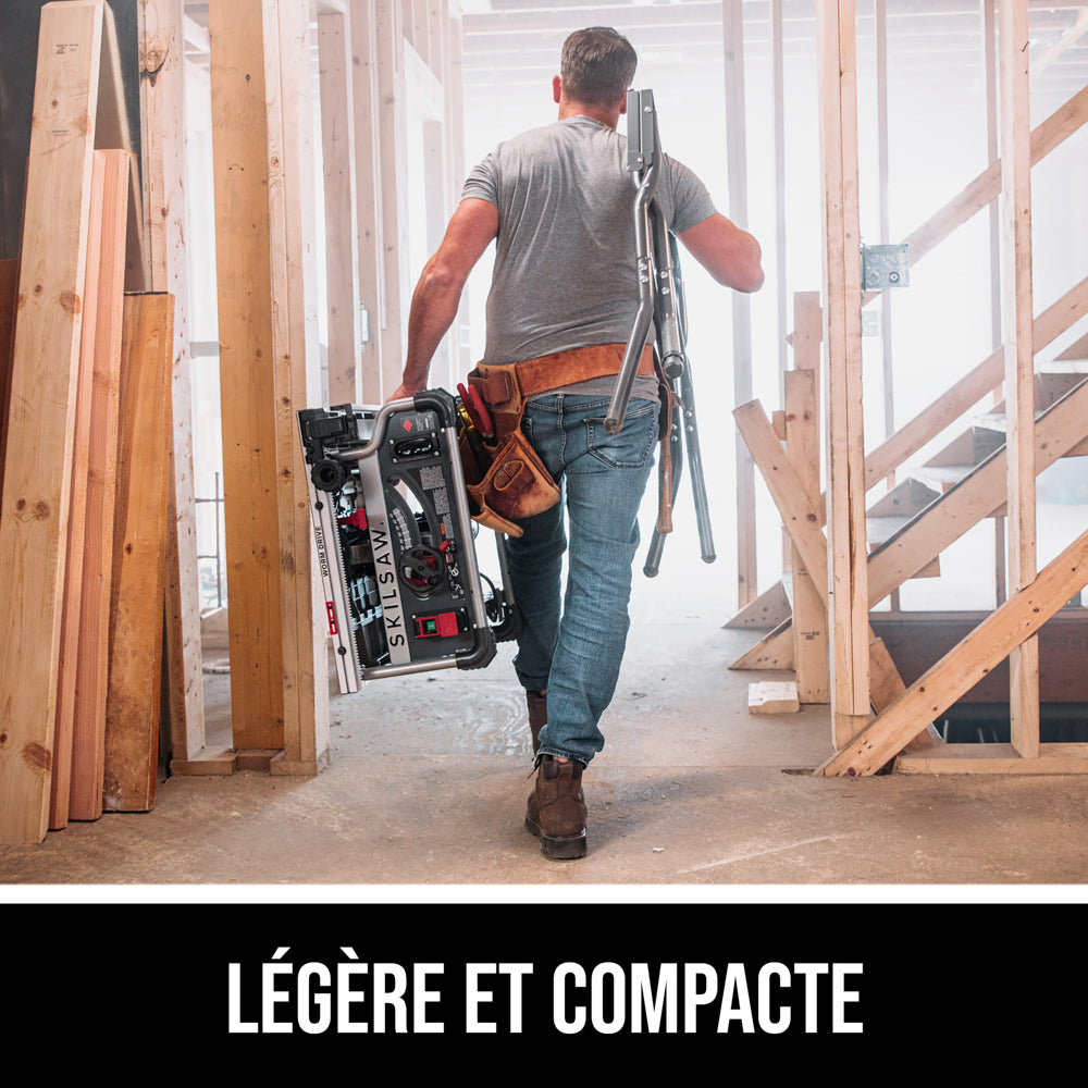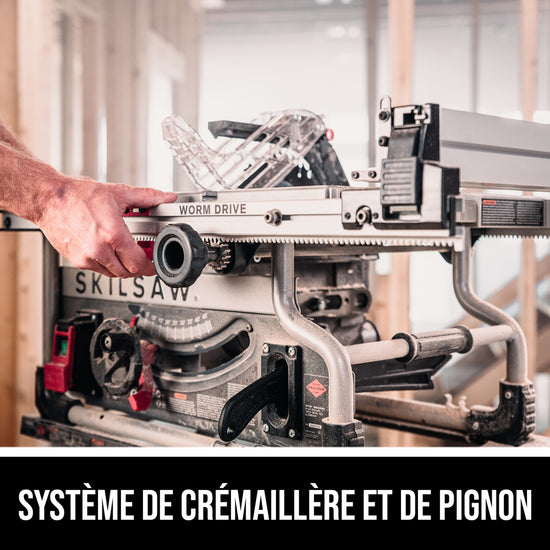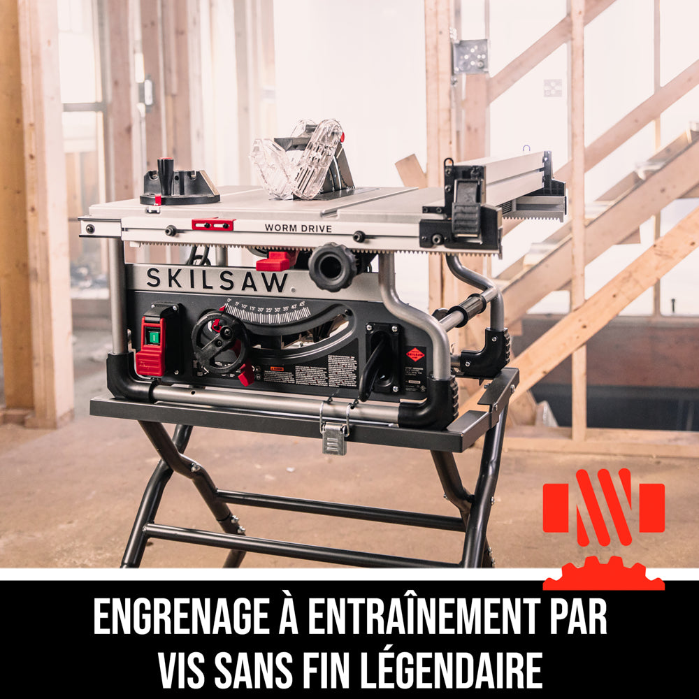 Ce qui est inclus: Scie à table portative à vis sans fin SKILSAW® SPT99T de 8-1/4 po (210 mm), lame en carbure SKILSAW® à 24 dents pour la coupe longitudinale, guide à onglet, guide à crémaillère et pignon, système de protection intelligent comprenant un dispositif anti-rebond, une plaque d'insertion, un poussoir et une clé.