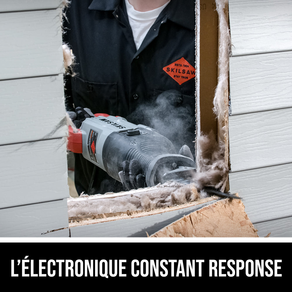 La scie alternative de grande puissance de 15 A fournit une excellente performance très fiable supérieure à celle de toutes les autres scies alternatives que vous avez pu utiliser auparavant. La technologie brevetée BUZZKILL™ met fin aux vibrations au moment même où elles commencent. Le contrepoids linéaire plein cadre arrête les vibrations à la source, au lieu de les déplacer et de les reporter sur l’utilisateur, comme le font d’autres scies. Le moteur de 15 ampères alimente les travaux les plus exigeants, tandis que l’électronique Constant Response™ détecte la charge et augmente immédiatement la puissance lorsque vous en avez besoin. Cela se traduit par des coupes confortables et contrôlées qui n’useront pas votre outil et ne vous fatigueront pas. La scie alternative de grande puissance de 15 A rejoint la performance légendaire des outils SKIL.