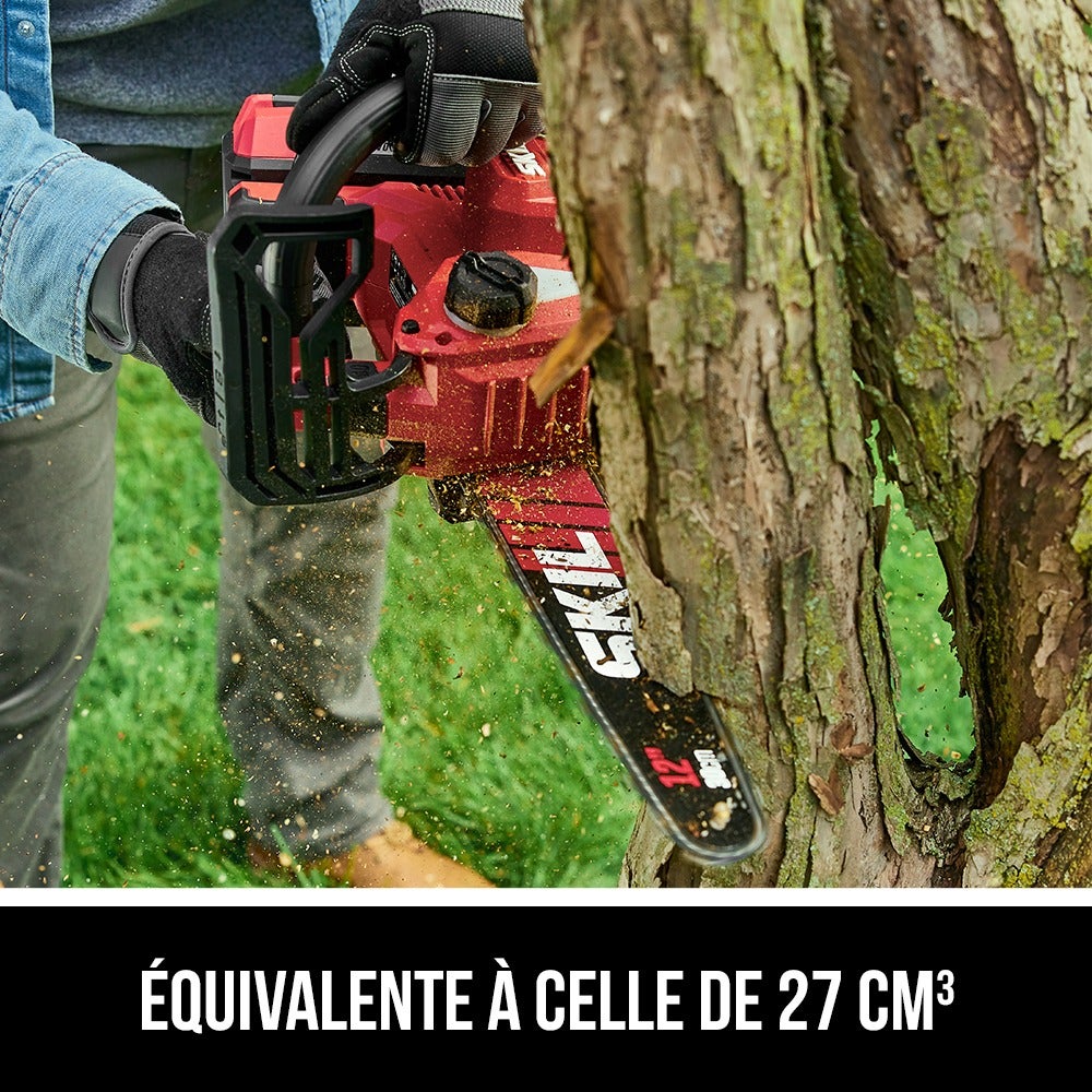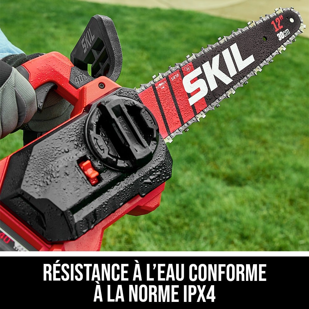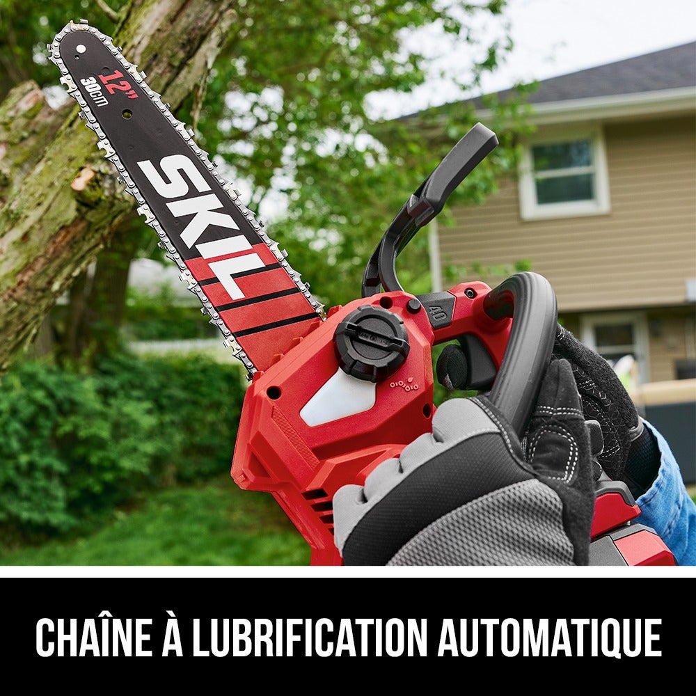 Taillez et élaguez les branches facilement avec la scie à chaîne à poignée supérieure compacte, légère et bien équilibrée SKIL PWRCORE 40™ de 12 po. Grâce à cette scie alimentée par la technologie PWRCORE 40™ lithium de 40 V, vous pouvez renoncer à l’essence mais conserver la puissance d’un moteur à essence équivalent de 27 cm3 avec cette scie à chaîne sans fil à poignée supérieure. Compacte et légère, elle est facile à manœuvrer, et elle réduit la fatigue lors de la taille, de l’élagage et de l’ébranchage. La scie à chaîne est équipée d’une chaîne à pas de ¼ po pour produire des coupes en douceur et précises. La chaîne se lubrifie aussi automatiquement pour assurer une plus grande longévité. Une molette pratique sur le côté de l’outil permet de régler la tension de la chaîne rapidement et facilement, sans outil. Le kit comprend la scie à chaîne à poignée supérieure, la pile au lithium PWRCORE 40™ de 2,0 Ah et le chargeur de 40 V, 60 W.