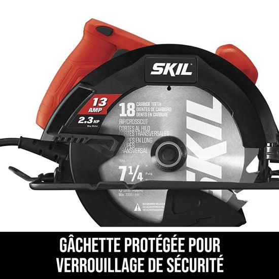 Depuis la coupe d’étagères jusqu’à la coupe de garnitures en onglets, la scie circulaire SKIL 5080 de 7-1/4 po est une excellente scie pour vous attaquer aux projets de bricolage dans votre atelier à domicile. Cette scie circulaire filaire est équipée d’un moteur de 13 A et de 2,3 HP qui délivre jusqu’à 5 300 tours/minute pour réaliser une grande variété de coupes dans le bois de construction et les matériaux en feuilles courants. Le chasse-sciures intégré maintient la ligne de coupe exempte de sciures pour permettre un travail de précision. Son biseau de 51 degrés avec butée positive à 45 degrés permet de réaliser des coupes variées avec une capacité de coupe maximale de 2-7/16 po. La scie SKIL est équipée d’un système de verrouillage de la broche et d’une aire de rangement de la clé sur l’outil pour permettre un changement de lame rapide et pratique. La scie circulaire électrique est équipée d’une lame de scie circulaire au carbure de 18 dents de 7-1/4 po.