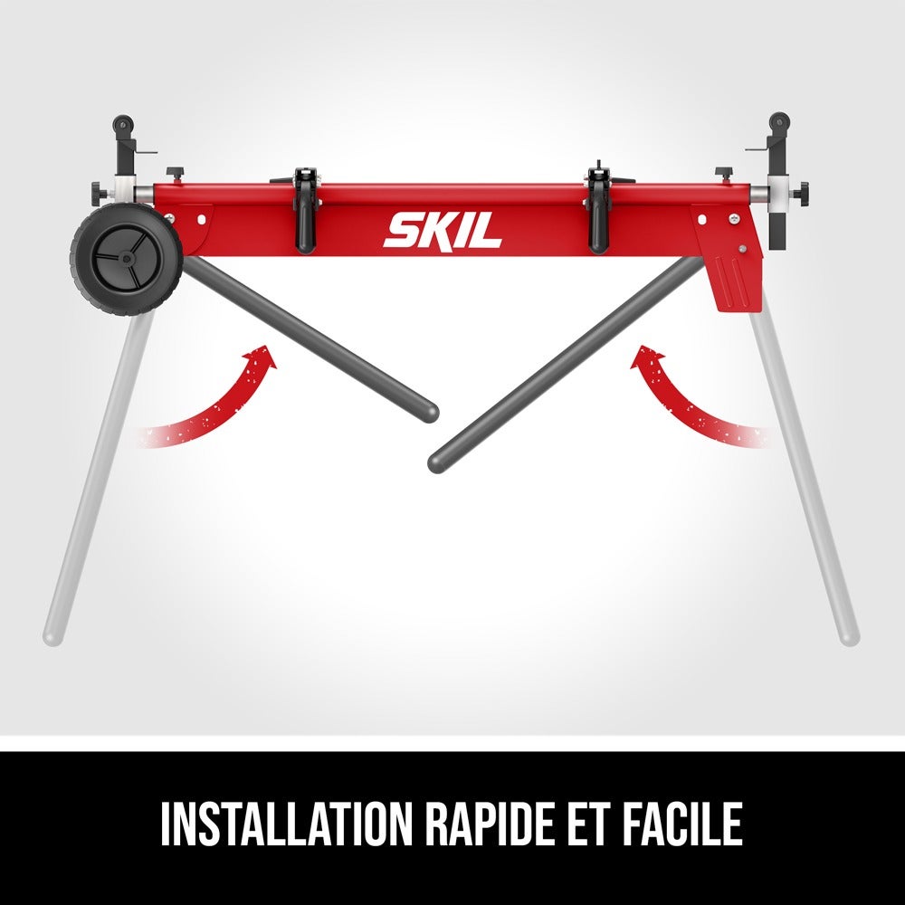 Le support de scie à onglets portable SKIL est conçu pour les scies à onglets SKIL, y compris la scie MS6316, avec une compatibilité universelle pour s’adapter à la plupart des marques de scies à onglets. Il comporte des supports de montage à relâchement rapide qui permettent de monter et de démonter facilement la scie à onglets du support sans outils. Ses pieds en acier durables et pliables, ainsi que les bras de support qui se glissent dans le support, permettent une installation, un rangement et un transport rapides et faciles. Les roues robustes de 8 po permettent au support de rouler pour assurer un transport facile. Deux rouleaux en acier facilitent l’alimentation des pièces longues, avec une butée de longueur pour produire des coupes répétitives régulières.