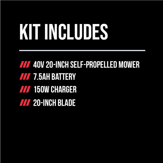Ce qui est inclus: Tondeuse autopropulsée 40 V (SM2010C-00), pile 40 V 7,5 Ah (BY3000C-00), chargeur automatique PWRJUMP™ 150 W (SC5364-00), filtre mulching, sac à herbe, (1) Rail de rangement facile