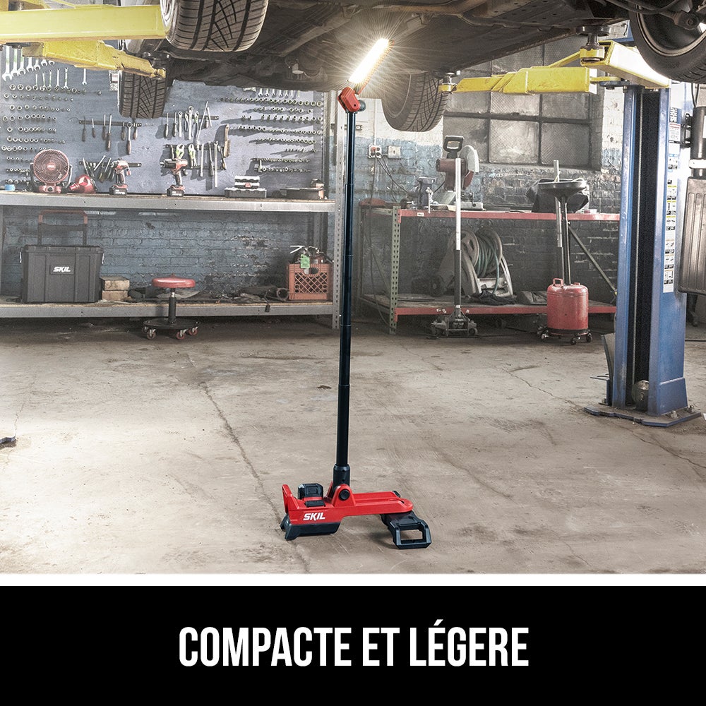 Dirigez la lumière là où vous en avez besoin rapidement et facilement avec le luminaire sur trépied compact SKIL de 12 V/20 V, qui est alimenté par des piles PWRCORE 12™ ou PWRCORE 20™. Ce luminaire sur trépied compact s’installe rapidement et facilement sans outils : il suffit de déplier les pieds, de déployer la perche et de se mettre au travail. Activez et réglez la luminosité sur trois niveaux possible – 200, 1 000 ou 2 500 lumens – grâce à l’interrupteur à pédale, et dirigez la lumière là où vous en avez besoin avec plus de contrôle grâce au pivot / à la charnière pouvant tourner de 270 degrés. Profitez de jusqu’à 4,5 heures d’autonomie de fonctionnement à 1 000 lumens grâce à la pile PWRCORE 20™ de 2,0 Ah incluse. Vous pouvez aussi charger la pile ou des appareils personnels avec le port USB-C de 100 W de la pile. Une fois le travail terminé, le luminaire sans fil se plie et se replie pour réduire l’encombrement, ce qui facilite le stockage et le transport. Le kit comprend le luminaire sans fil, une pile USB-C de 20 V 2,0 Ah, un chargeur PD USB-C de 20 W et un câble USB-C à USB-C.