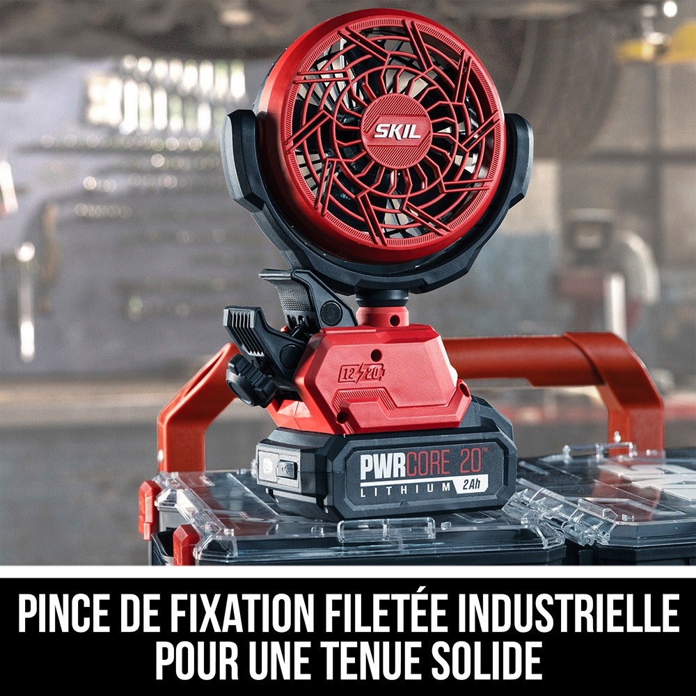 Le ventilateur à pince de fixation SKIL de 12 V / 20 V sans balais de 4 po peut être alimenté par des piles PWRCORE 12™ ou PWRCORE 20™. Il offre également une option de courant alternatif hybride pour être alimenté via USB-C. Ce ventilateur à pince de fixation pratique et compact fournit un flux d’air puissant allant jusqu’à 200 pi3/min avec des vitesses d’air allant jusqu’à 11 MPH. Sa pince filetée industrielle offre une forte capacité de fixation. Ce ventilateur sans fil est conçu pour les espaces restreints ou pour une utilisation en déplacement, et sa tête multidirectionnelle pivotante et orientable peut envoyer l’air là où vous en avez besoin. Il peut fonctionner pendant jusqu’à 14 heures en mode de basse vitesse lorsqu’il est alimenté par une pile PWRCORE 20™ de 2,0 Ah, 20 volts ou jusqu’à 8,5 heures en mode de basse vitesse avec une pile PWRCORE 12™ de 2,0 Ah, 12 volts (piles vendues séparément).