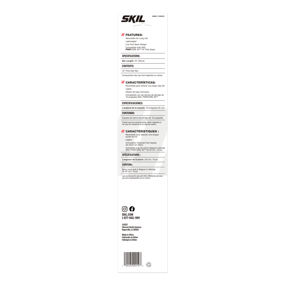 The SKIL 10 In. Pole Saw Replacement Bar is designed for use with SKIL PWRCORE™ 40 10-inch pole saws. This 10-inch replacement pole saw bar is reversible for long life, lightweight to help reduce fatigue, and features a low kickback design for user safety. Keep your SKIL 10-inch pole saw performing at its best with this genuine SKIL replacement part.
