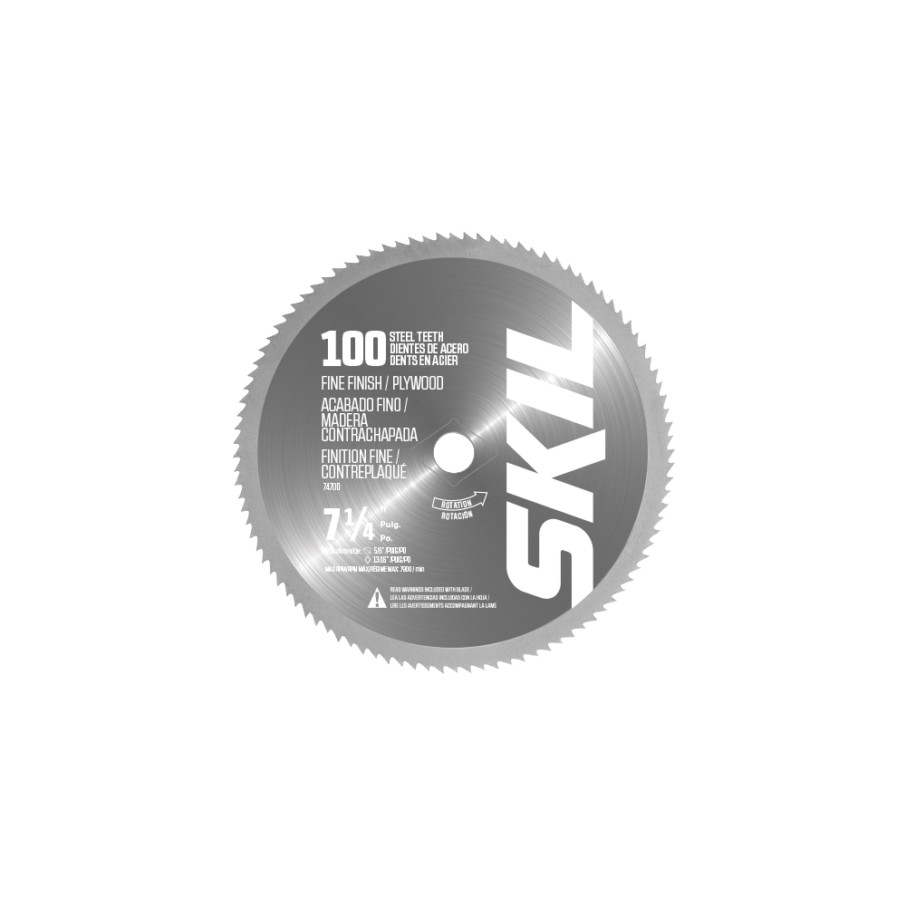 The SKIL 7-1/4 In. 100-Tooth Plywood Circular Saw Blade is designed to cut through hardwood, soft wood, and plywood, and its 100-tooth construction provides a smooth finish when cutting across the grain in all wood types up to 1 ¼ inches thick. A clear, anti-stick coating reduces friction and heat with less bogging down. The coating also prevents rust and oxidation, keeping the blades fresh and ready for use. Its diamond knockout arbor allows you to choose between a traditional 5/8-inch arbor or diamond-shaped knockout for compatibility with a wider range of corded and cordless circular saws. This bulk pack includes 25 blades.