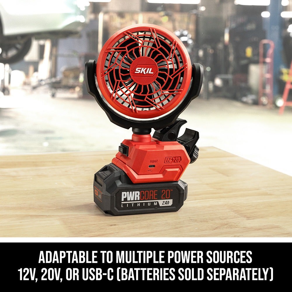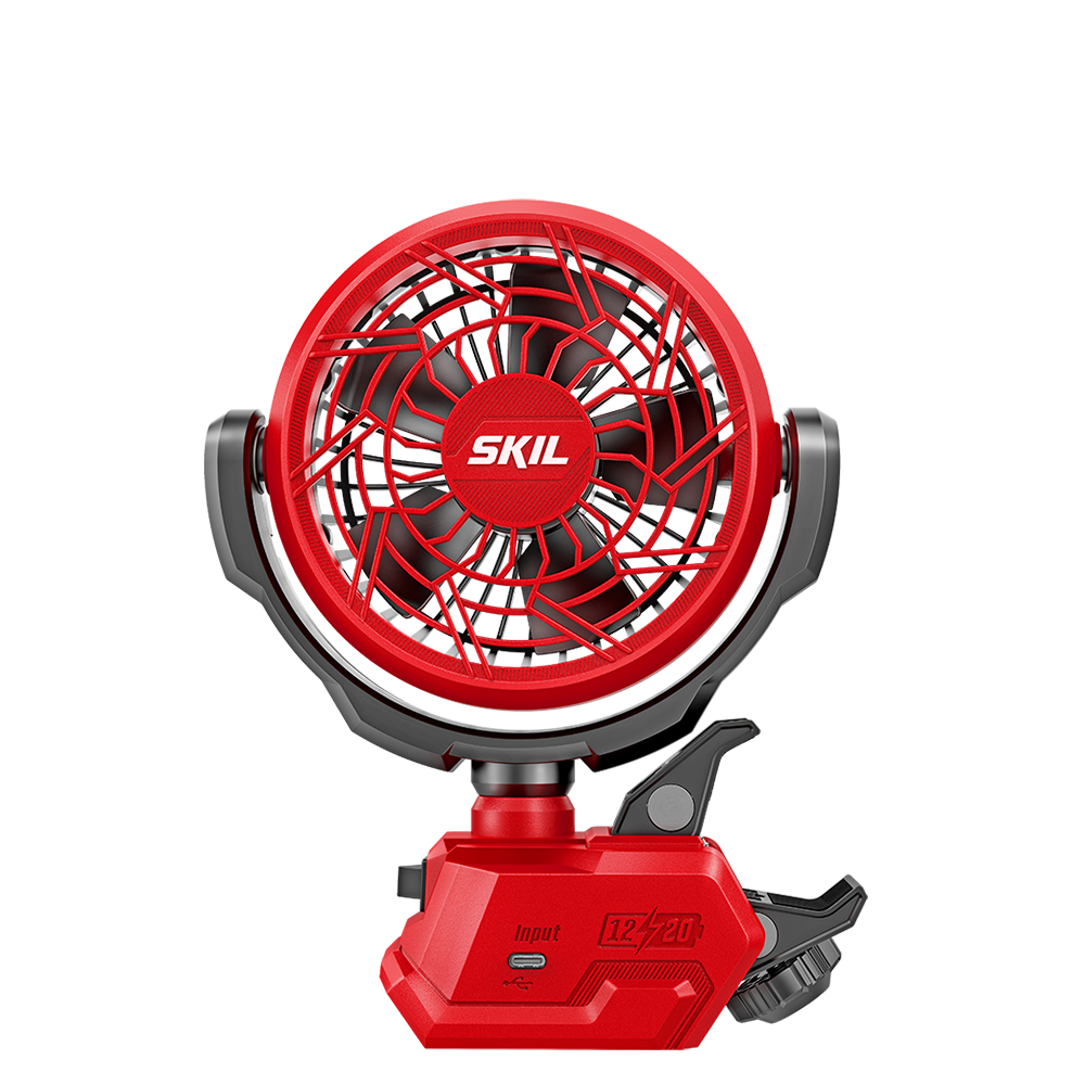 The SKIL 12V/20V Brushless 4 In. Clamp Fan can be powered by either PWRCORE 12™ or PWRCORE 20™ batteries. It also offers a hybrid AC option to be powered via USB-C. This convenient, compact clamp fan delivers powerful airflow up to 200 CFM with airspeeds up to 11 MPH. Its industrial threaded clamp provides strong holding capacity. This cordless fan is built for tight spaces or easy on-the-go use, and its multidirectional pivoting and swiveling head can send air where you need it. It runs up to 14 hours on low when powered by a PWRCORE 20™ 2.0Ah 20-volt battery or up to 8.5 hours on low with a PWRCORE 12™ 2.0Ah 12-volt battery (batteries sold separately).