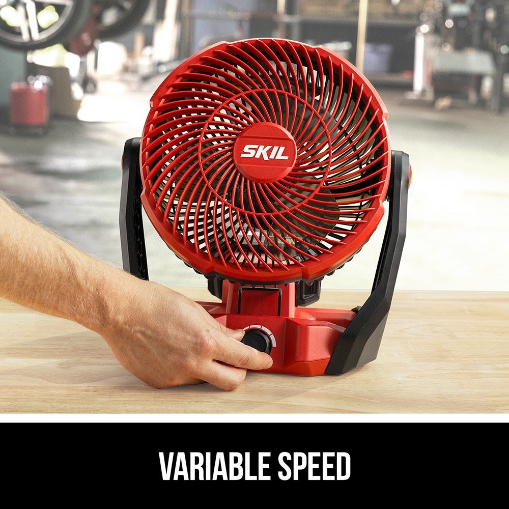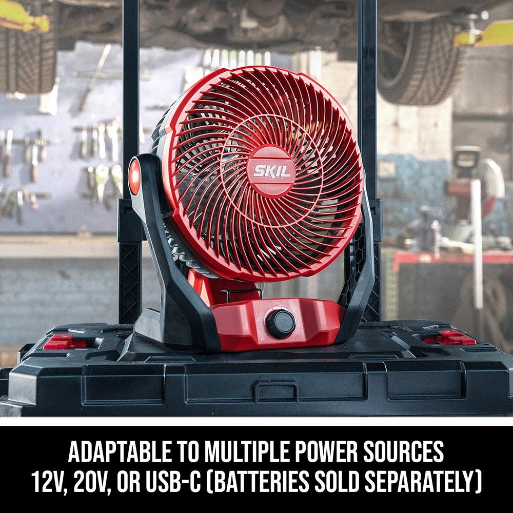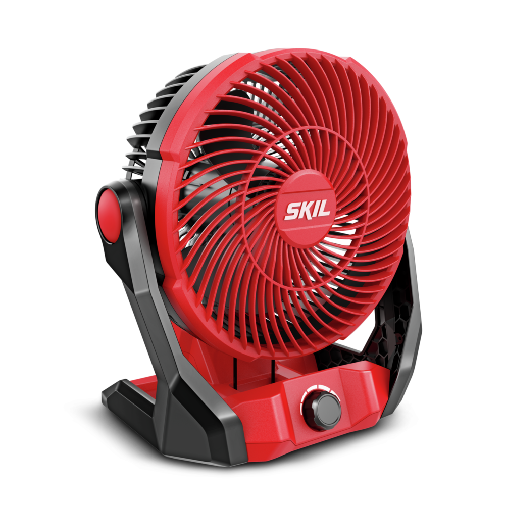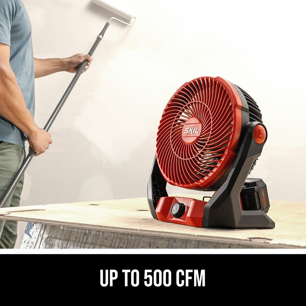 The SKIL 12V/20V Brushless 7 In. Fan can be powered by either PWRCORE 12™ or PWRCORE 20™ batteries. It also offers a hybrid AC option to be powered via USB-C for continuous operation. This portable area fan delivers powerful airflow up to 600 CFM with a 180-degree pivoting head to send air where you need it, and includes a built-in rafter hook for versatile mounting. This 7-inch cordless fan runs up to 3 hours on high when powered by a PWRCORE 20™ 2.0Ah 20-volt battery or up to 1.5 hours on high with a PWRCORE 12™ 2.0Ah 12-volt battery (batteries sold separately).
