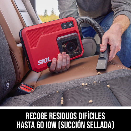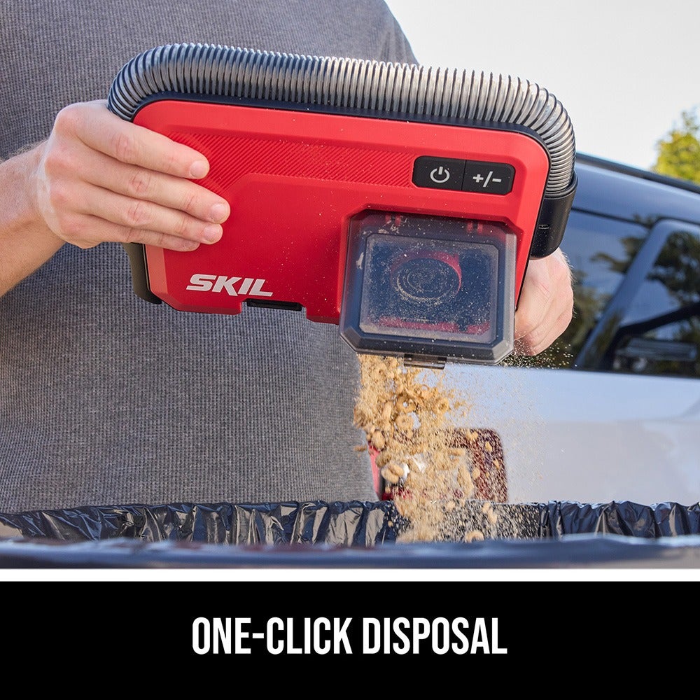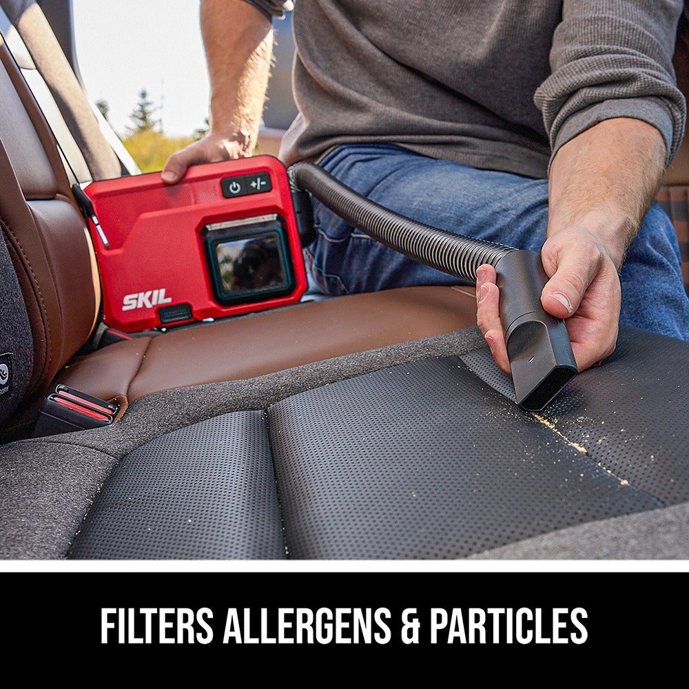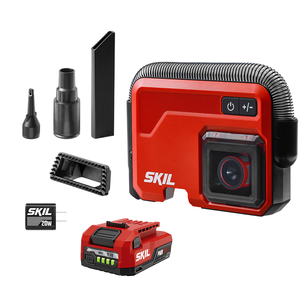 Clean up crumbs, dirt, and debris from floormats and hard-to-reach spots in your vehicle with the SKIL 12V/20V Brushless Slim Vacuum. This compact cordless vacuum features a slim, two-inch thick depth for easy storage in seatback pockets and includes a hanging clip for easy access when you’re on the go. The cordless car vacuum delivers powerful suction with up to 60 inches of water lift (sealed suction) to pick up tough debris. Empty the vacuum when it’s full with simple one-click disposal. Onboard storage conveniently stows the included crevice and brush nozzles as well as inflator attachments for easy access. Its flexible hose reaches up to 3.5 feet to access corners and crevices, and multilayer filtering traps allergens and particles as small as 0.3 microns. The included 12V 2.0Ah USB-C battery features two-way rapid charging that allows you to charge the battery or portable devices with its 60W USB-C port. When it’s time to recharge the battery, the multifunctional charger ditches the traditional power tool charging dock for a compact, convenient format that can plug in anywhere. The kit includes the compact vacuum, 12V 2.0Ah USB-C battery, 20W USB-C charger, charging cable, crevice nozzle, brush nozzle, (2) clips, and (2) inflator attachments.