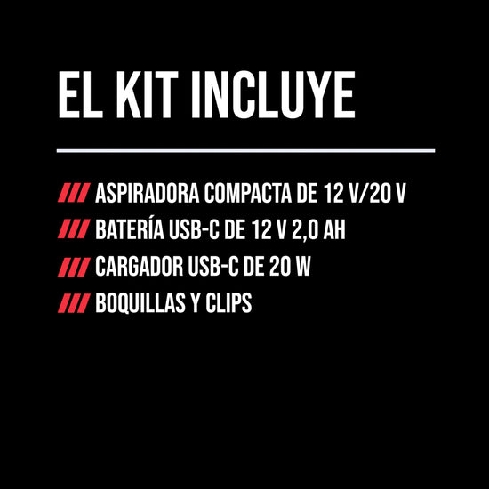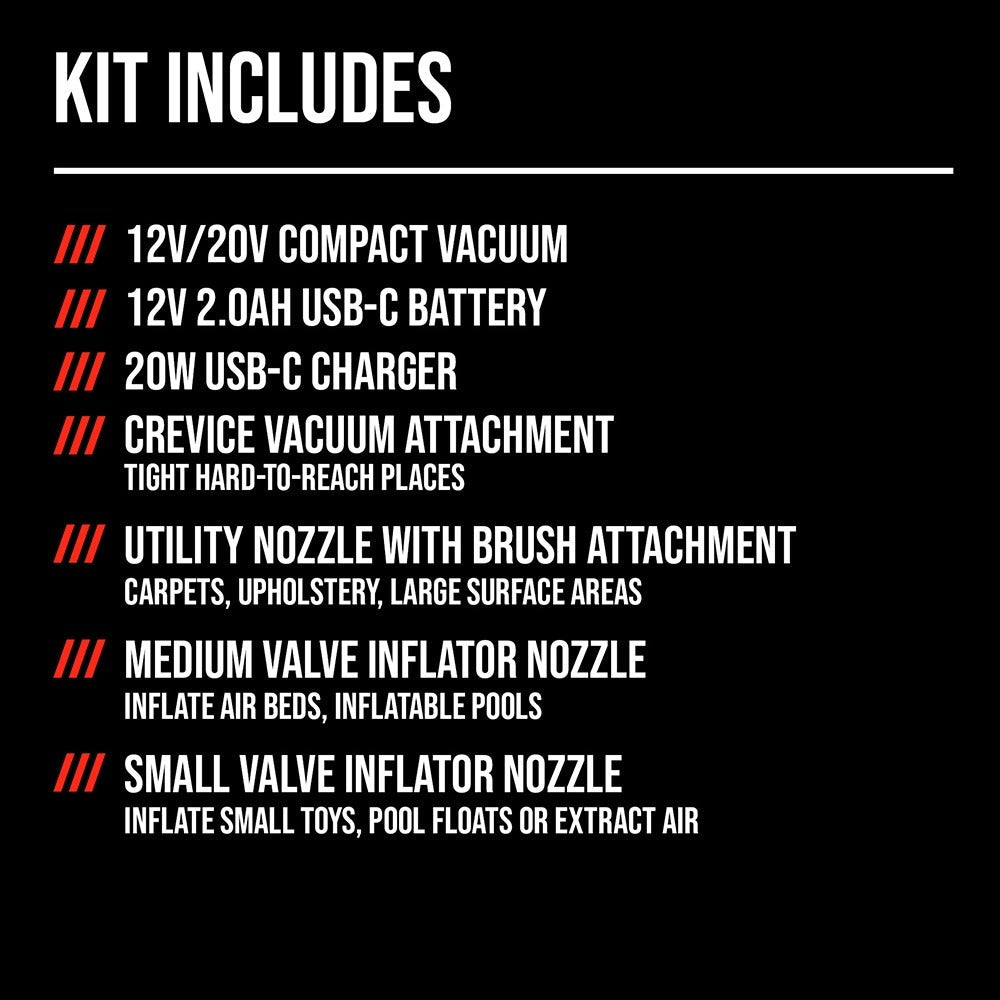 - CORDLESS VACUUM KIT - Includes the 12V/20V compact vacuum, 12V 2.0Ah USB-C battery, 20W USB-C charger, charging cable, crevice nozzle, brush nozzle, (2) clips, and (2) inflator attachments