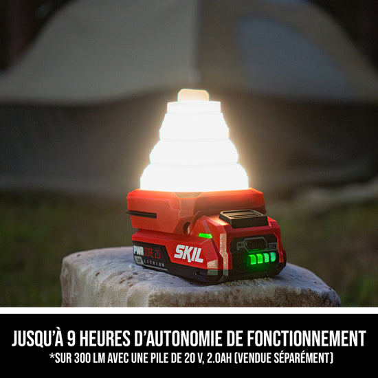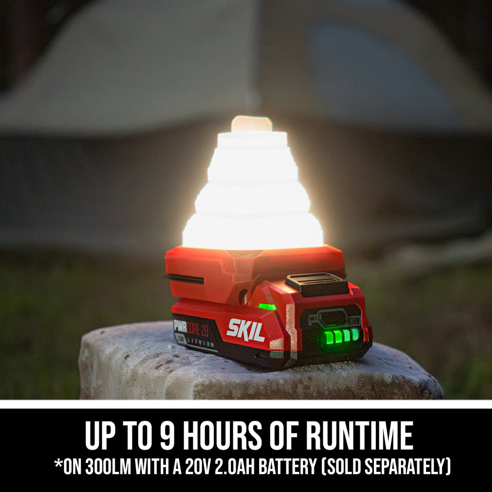 Whether you’re camping or in need of a light that’s easy to pack and take on-the-go, the SKIL 12V/20V Collapsible Lantern delivers up to 300 lumens of 360-degree illumination that collapses into a small footprint for easy transport and storage. It features a retractable hook for versatile mounting whether it’s in a tent, from a tree branch, or under the sink. A USB-C out port allows you to power and charge devices while the lantern is in use.