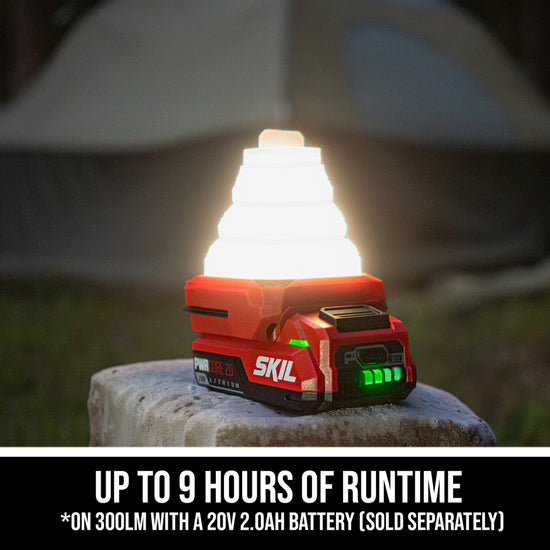 - UP TO 9 HOURS OF RUNTIME - Up to 9 hours of runtime on 300lm with a 20V 2.0Ah battery (sold separately); up to 5.5 hours of runtime on 300lm with a 12V 2.0Ah battery (sold separately)