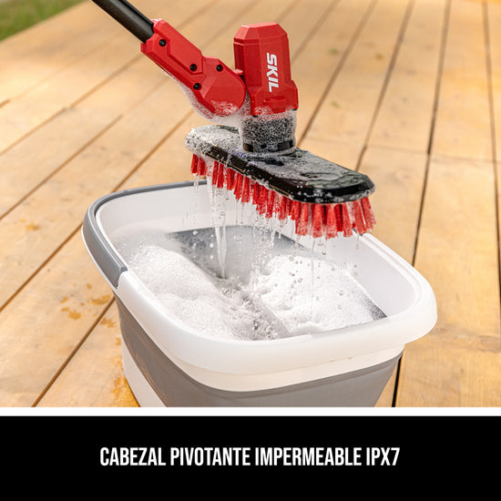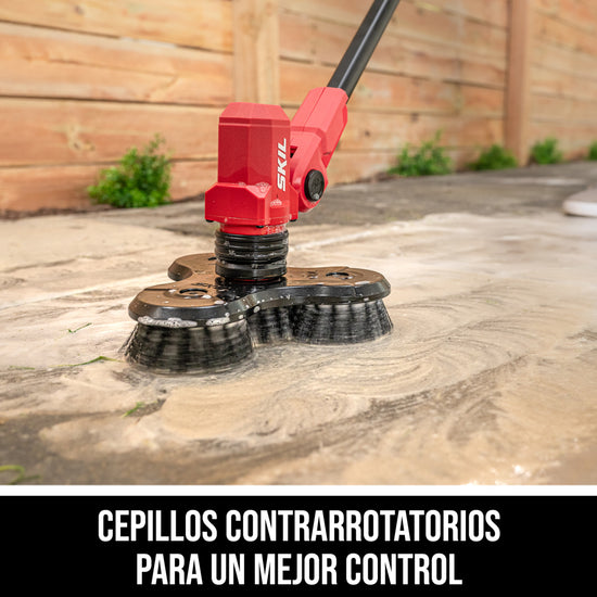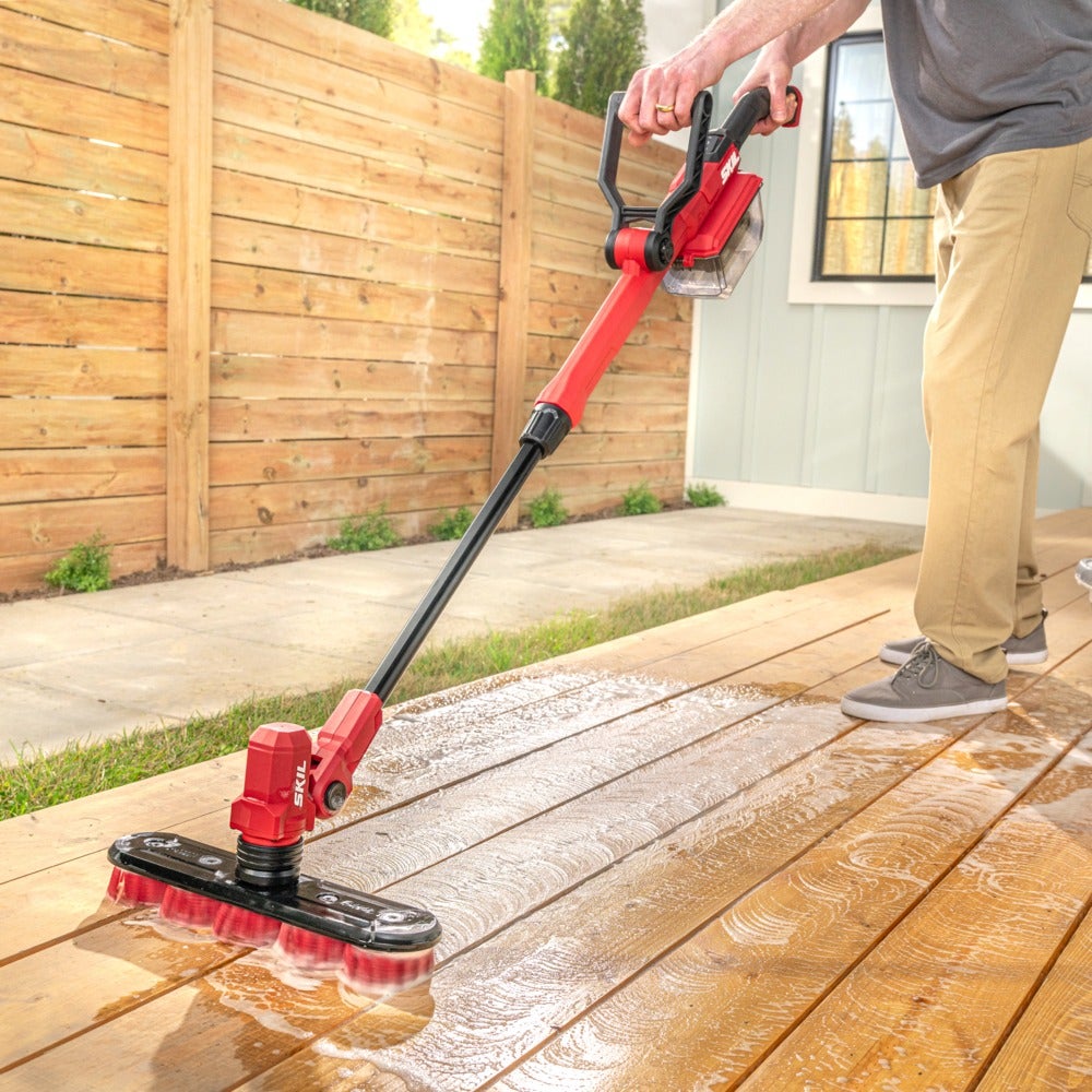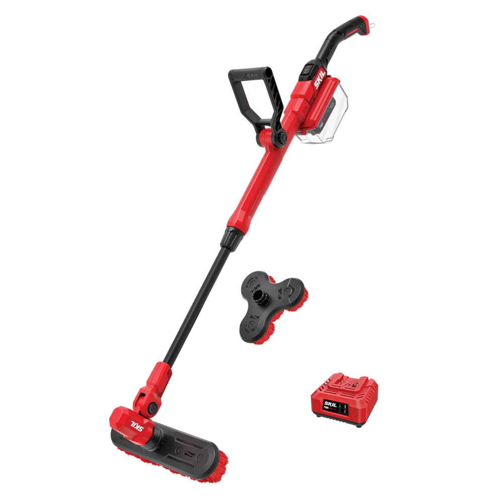 Clean a variety of surfaces from bathtubs and shower tile to outdoor siding, decks, patios, and more with the SKIL 12V/20V Power Scrubber. Interchangeable quick-release brushes allow for easy brush head swaps to quickly transition between tasks. The IPX7 waterproof head allows for submersion into buckets of water, and it pivots to fully contact the surface you’re working on. Each brush head has multiple counter-rotating brushes that deliver better control and reduced fatigue by preventing tool runaway. The telescoping pole extends so you can clean hard-to-reach spots and its ergonomic auxiliary handle adjusts easily to deliver better control and limit fatigue. Toggle between 300 RPM and 500 RPM via the two-speed switch for various cleaning applications. The power scrubber kit includes two medium bristle brushes for moderate-duty cleaning on hard surfaces like decks, tile, and siding. A water-resistant battery case protects the battery from water exposure. The kit includes the 20V power scrubber, 20V 2.0Ah battery, 20V 60W charger, medium bristle triangular brush, and medium bristle long brush.