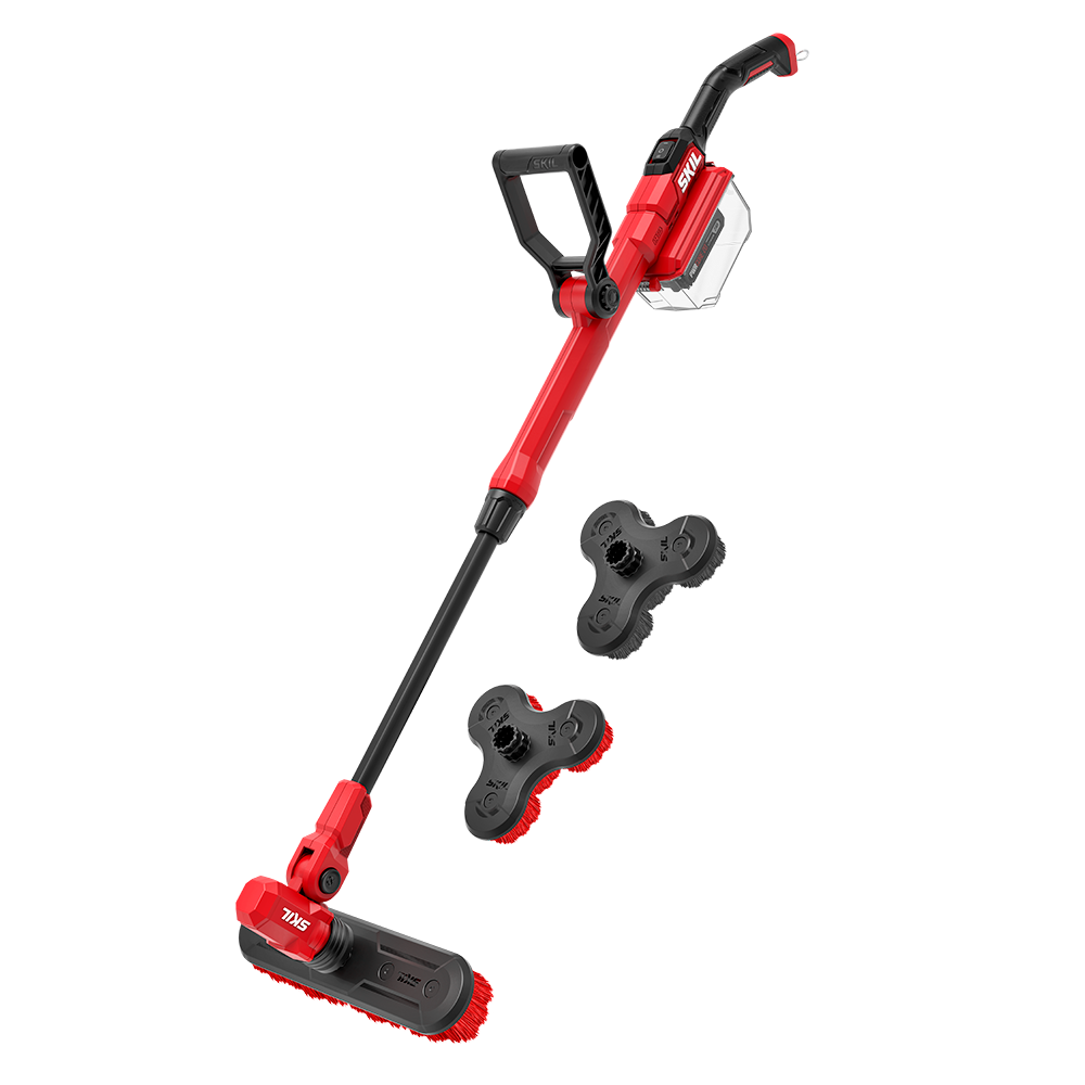 Clean a variety of surfaces from bathtubs and shower tile to outdoor siding, decks, patios, and more with the SKIL 12V/20V Power Scrubber. Interchangeable quick-release brushes allow for easy brush head swaps to quickly transition between tasks. The IPX7 waterproof head allows for submersion into buckets of water, and it pivots to fully contact the surface you’re working on. The telescoping pole extends so you can clean hard-to-reach spots and its ergonomic auxiliary handle adjusts easily to deliver better control and limit fatigue. Toggle between 300 RPM and 500 RPM via the two-speed switch for various cleaning applications. The power scrubber kit includes two medium bristle brushes for moderate-duty cleaning on hard surfaces like decks, tile, and siding as well as a hard bristle brush for heavy-duty cleaning of rough surfaces like brick, concrete, and other masonry. Each brush head has multiple counter-rotating brushes that deliver better control and reduced fatigue by preventing tool runaway. A water-resistant battery case protects the battery from water exposure. The kit includes the 20V power scrubber, 20V 2.0Ah battery, 20V 30W charger, medium bristle triangular brush, hard bristle triangular brush, and medium bristle long brush.