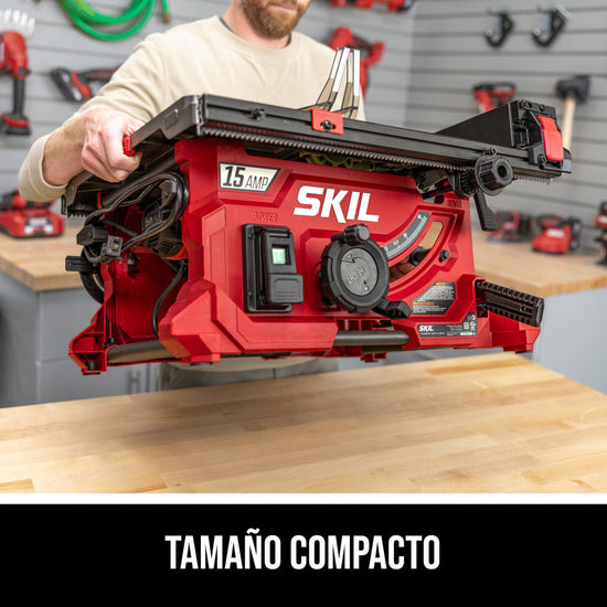 The SKIL 13 Amp 8-1/4 In. Compact Table Saw delivers power for a range of applications and cuts whether you’re cutting deck boards, framing out a wall in a basement remodel, building a bar, and more. Rip down sheets of plywood, make crosscuts, and cut dado joints confidently with the saw’s rack and pinion fence rails that ensure the fence stays parallel for fast, smooth, accurate cuts. Its compact size makes it easy to transport and store between use. The aluminum table allows high-quality cutting performance while a dust port elbow redirects dust to a container for easy cleanup. The parallel blade alignment allows for ease of blade adjustment along the rip fence and miter slot, for precise accurate cuts. A safety switch delivers immediate shutdown for added safety. The table saw comes with a miter gauge, push stick, modular guard system, fence, anti-kickback pawl, (2) blade change wrenches, and a dust port elbow.