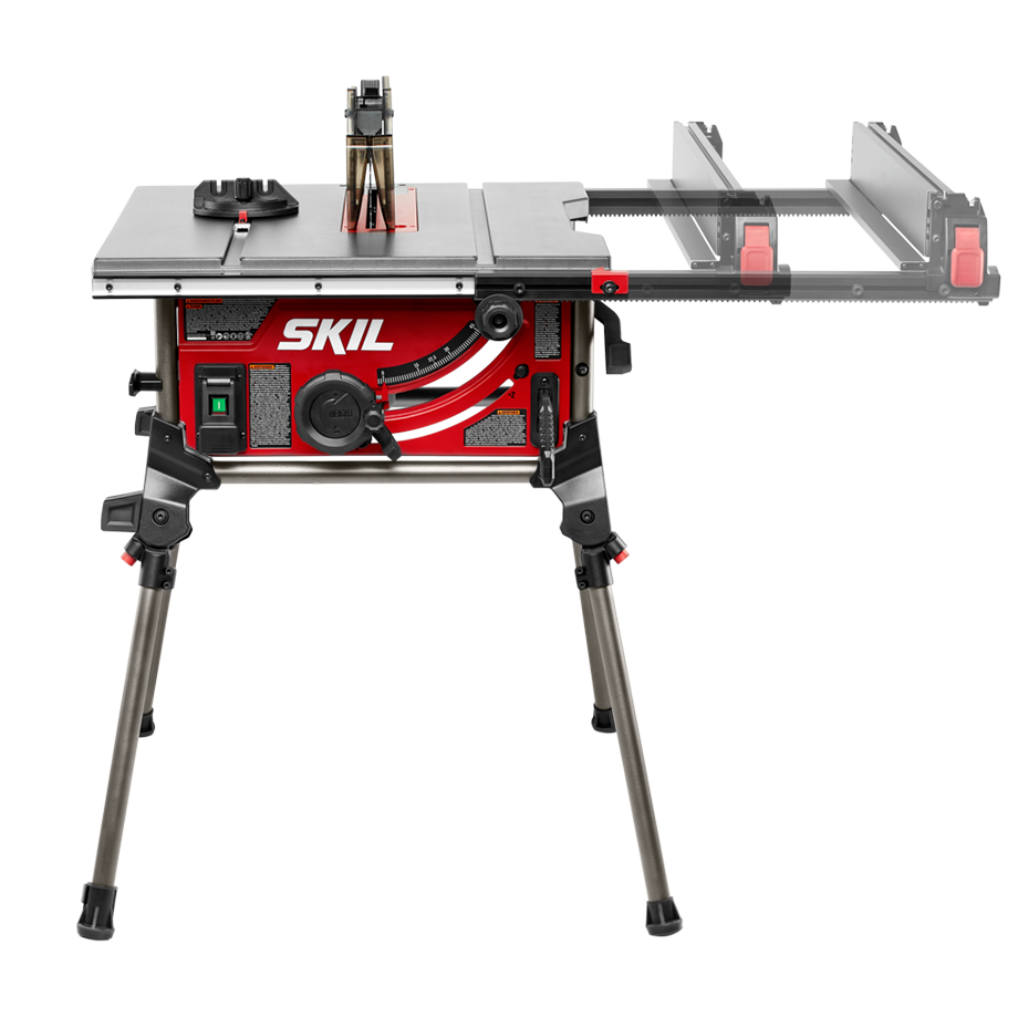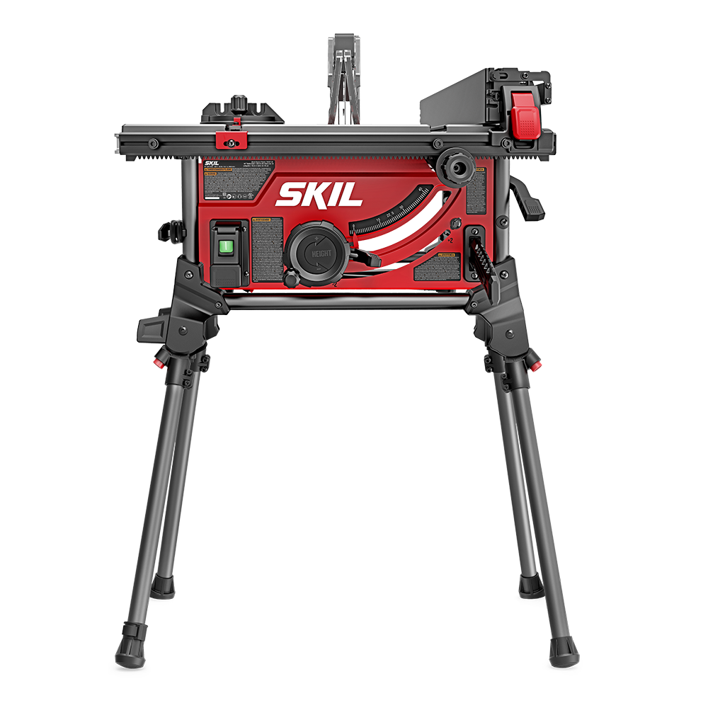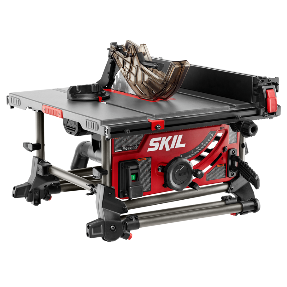 The SKIL TS6307-00 10" Jobsite Table Saw has a 25-1/2” (64.77cm) Rip Capacity and is equipped with a 15-Amp motor, integrated foldable legs, rack & pinion fence rails, and a dust port elbow to keep your jobsite clean. The 15-Amp motor quickly rips through hardwoods with ease, while the rack & pinion fence rails make fence adjustments fast, smooth, and accurate. With its 0-45° bevel capacity, the quick release lever allows for cuts between two positive stops at 0 and 45 degrees, and its 4x4 cutting capacity allows for swift 90-degree cutting. The integrated foldable legs seamlessly form into a folding stand to provide portability and convenience, while the dust port elbow systematically redirects dust to a container for easy cleanup. The parallel blade alignment allows for ease of blade adjustment along the rip fence and miter slot, for precise accurate cuts. This table saw features a safety anti-restart switch in case of power outages.