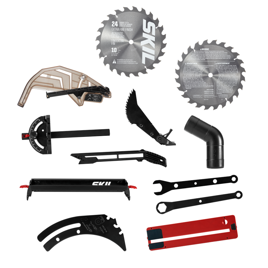 What's included: Table saw w/ integrated folding stand, blade guard, push stick, miter gauge, anti-kickback pawl, dust port elbow, 2pcs wrench, riving knife, rip fence, 24T blade, drive knob with washer and hex screw