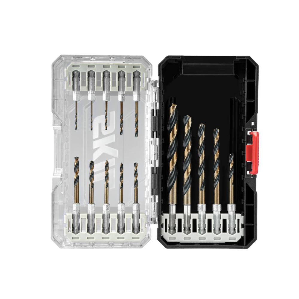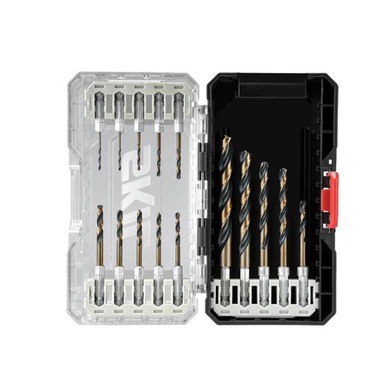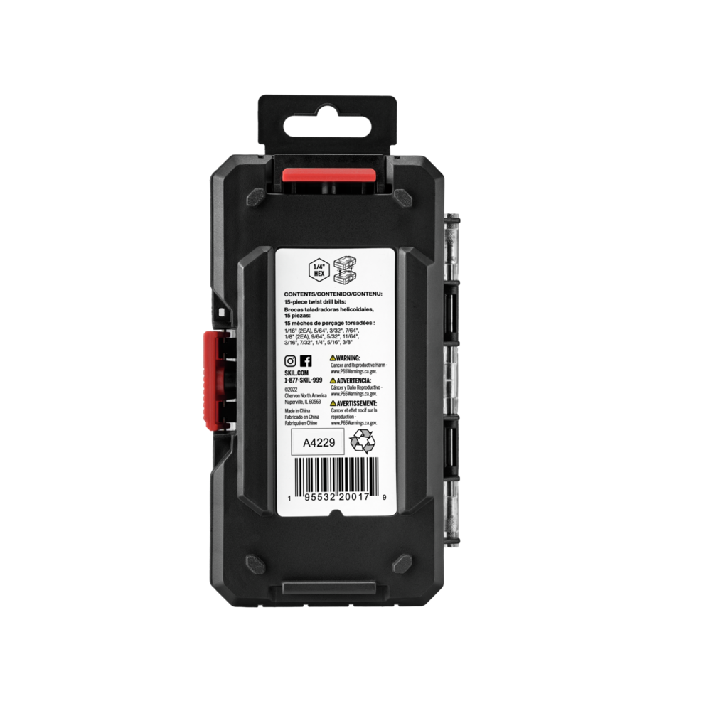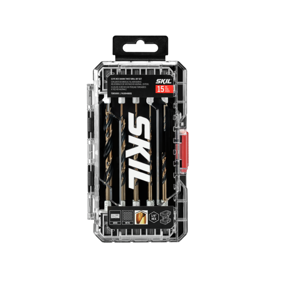 The SKIL 15-Piece Hex Shank Twist Drill Bit Set includes 15 twist drill bits with ¼-inch hex shanks for use with both drills and impact drivers. The bits have a 135-degree split angle for fast and no-slip drilling, and their black and golden oxide coating provides long-lasting bit life. The bits are packed in a SKIL modular bit case system for easy customized layouts, interlocking functions for stacking out your combination, and auto-connect snap latches for convenient one-handed use.