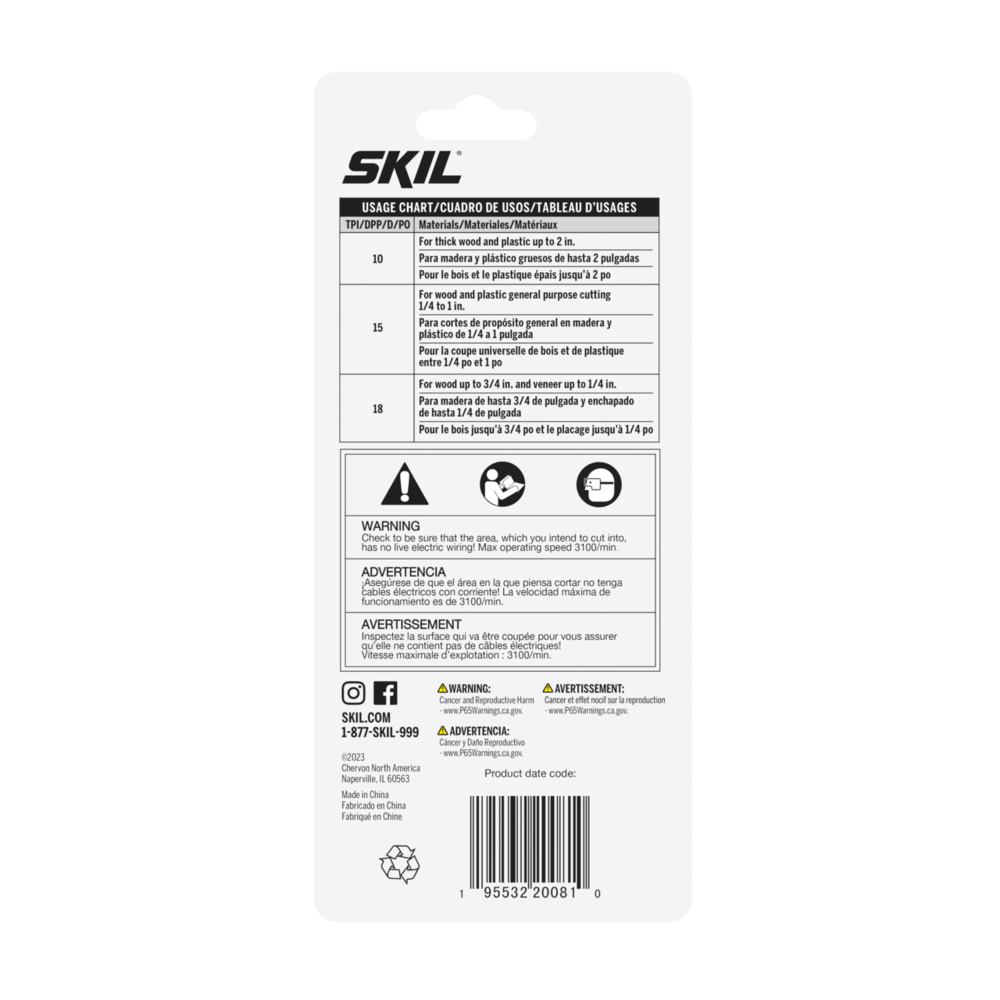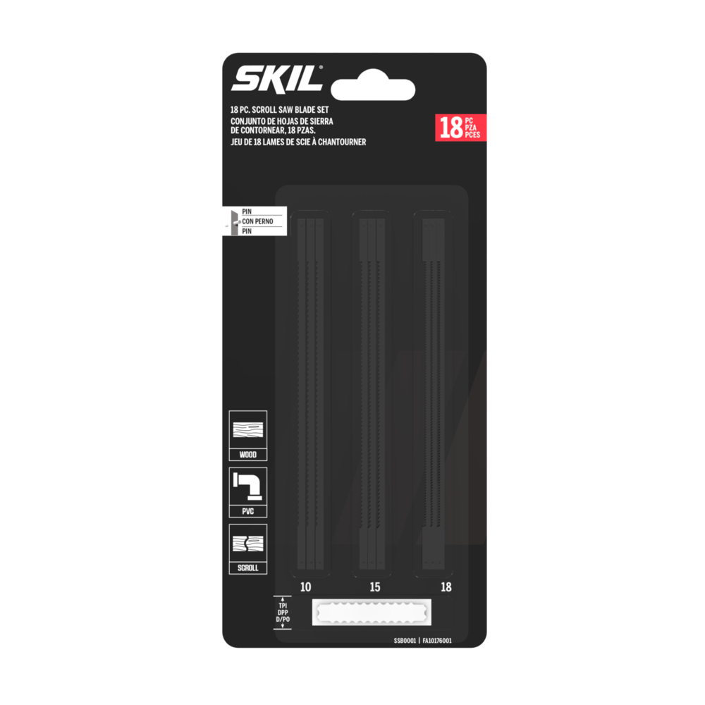 The SKIL 18 Pc. Scroll Saw Blade Set is an ideal set of blades with various TPI and widths for general purpose cutting of wood and plastics. The scroll saw blades are precision-sharpened to for easy cutting of intricate shapes and constructed from premium-grade steel for longer blade life. The scroll saw blade set includes both pinned-end and plain-end blades for use with most scroll saws. The set includes (6) 5-inch 10 TPI scroll saw blades, (6) 5-inch 15 TPI scroll saw blades, and (6) 5-inch 18 TPI scroll saw blades.