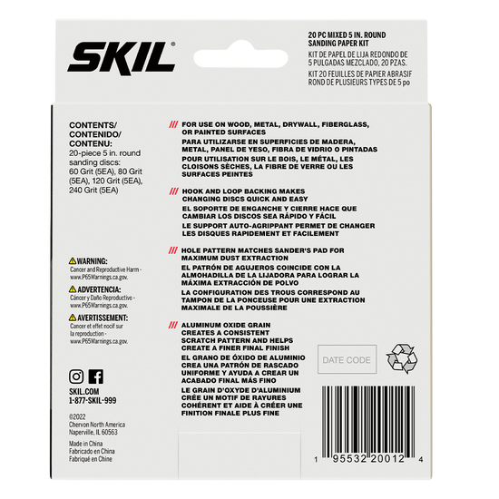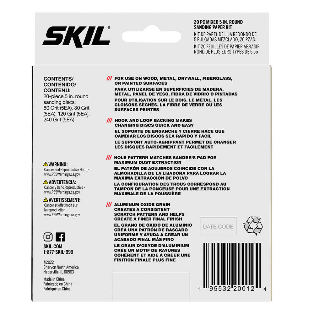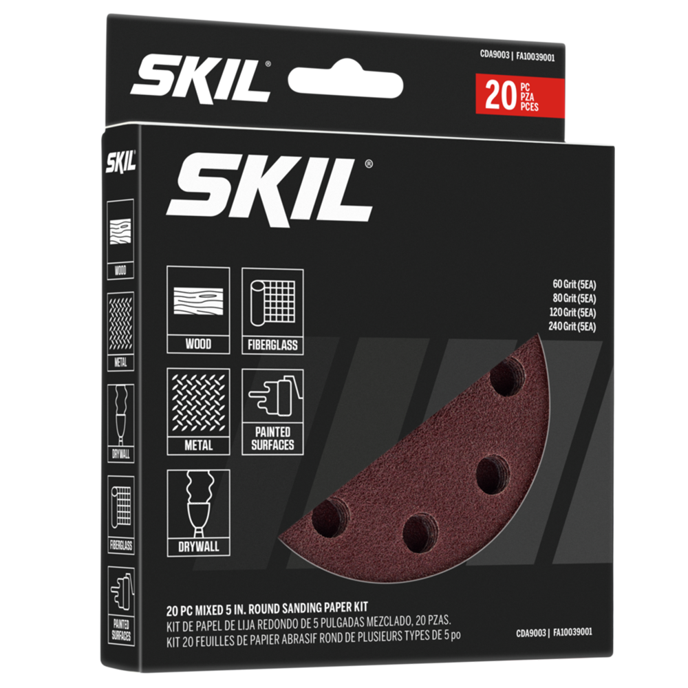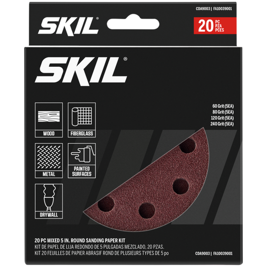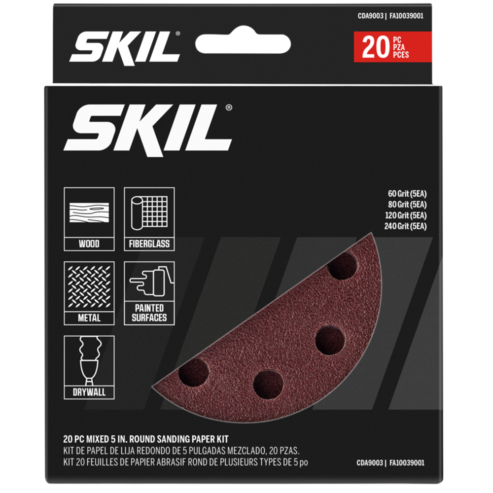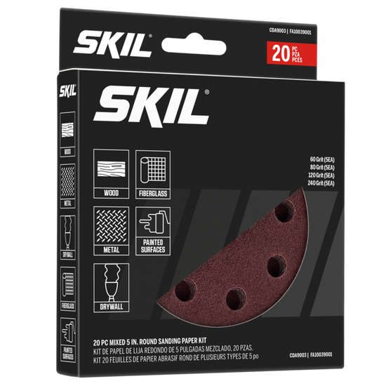 Tackle any sanding project with the SKIL 20-Piece Mixed 5-Inch Round Sanding Paper Kit. Aluminum oxide grain creates a consistent scratch pattern and helps create a finer finish when used on wood, metal, drywall, fiberglass, or painted surfaces. Hook and loop backing makes changing discs quick and easy, and the hole pattern matches the sander’s pad for maximum dust extraction. The kit includes various grit for sanding needs from coarse to extra-fine.