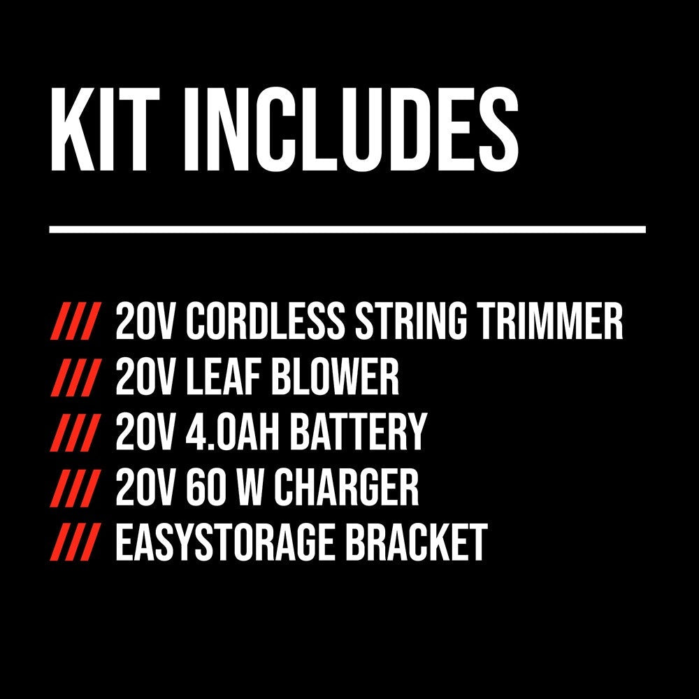 - STRING TRIMMER & LEAF BLOWER COMBO KIT – Includes the 20V cordless string trimmer, 20V leaf blower, 20V 4.0Ah battery, 20V 60W charger, and EASYSTORAGE bracket