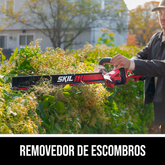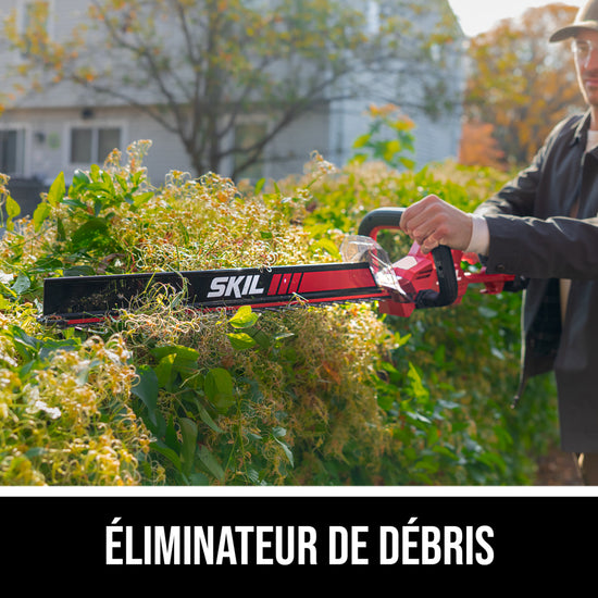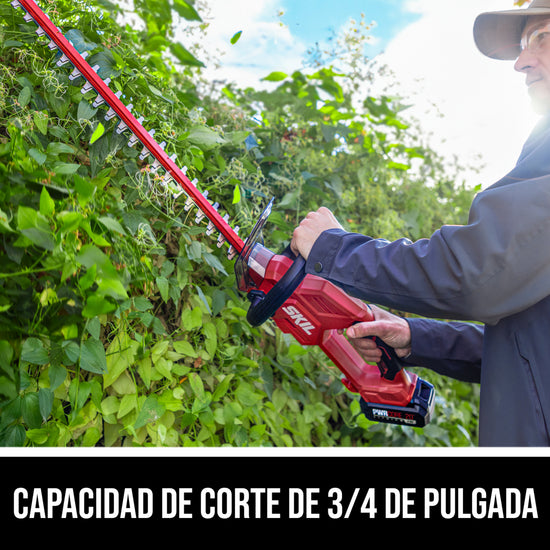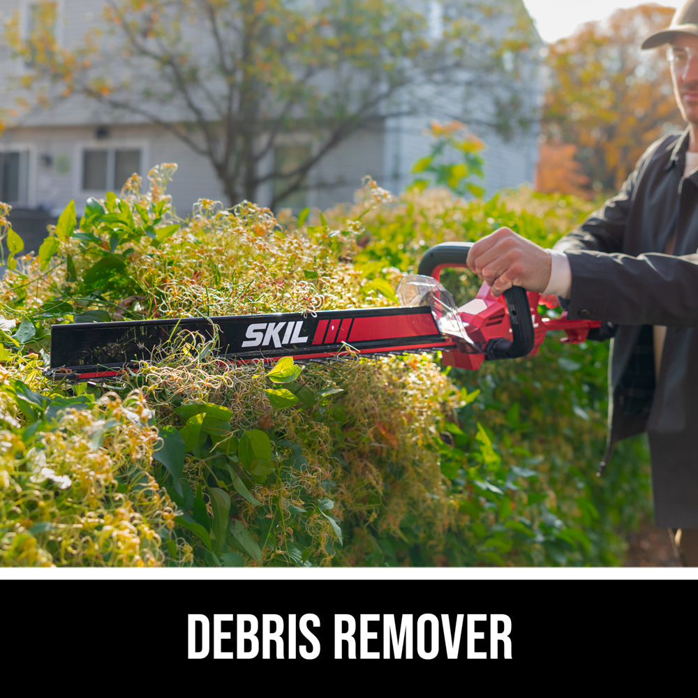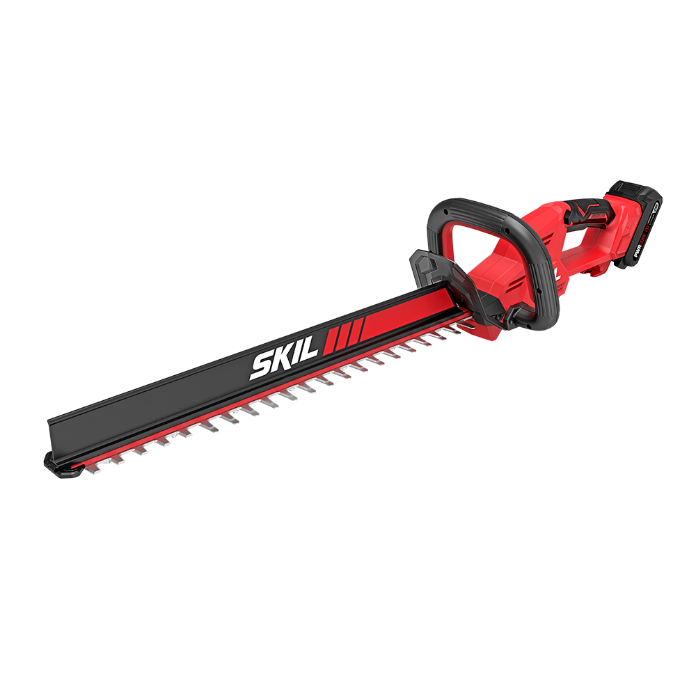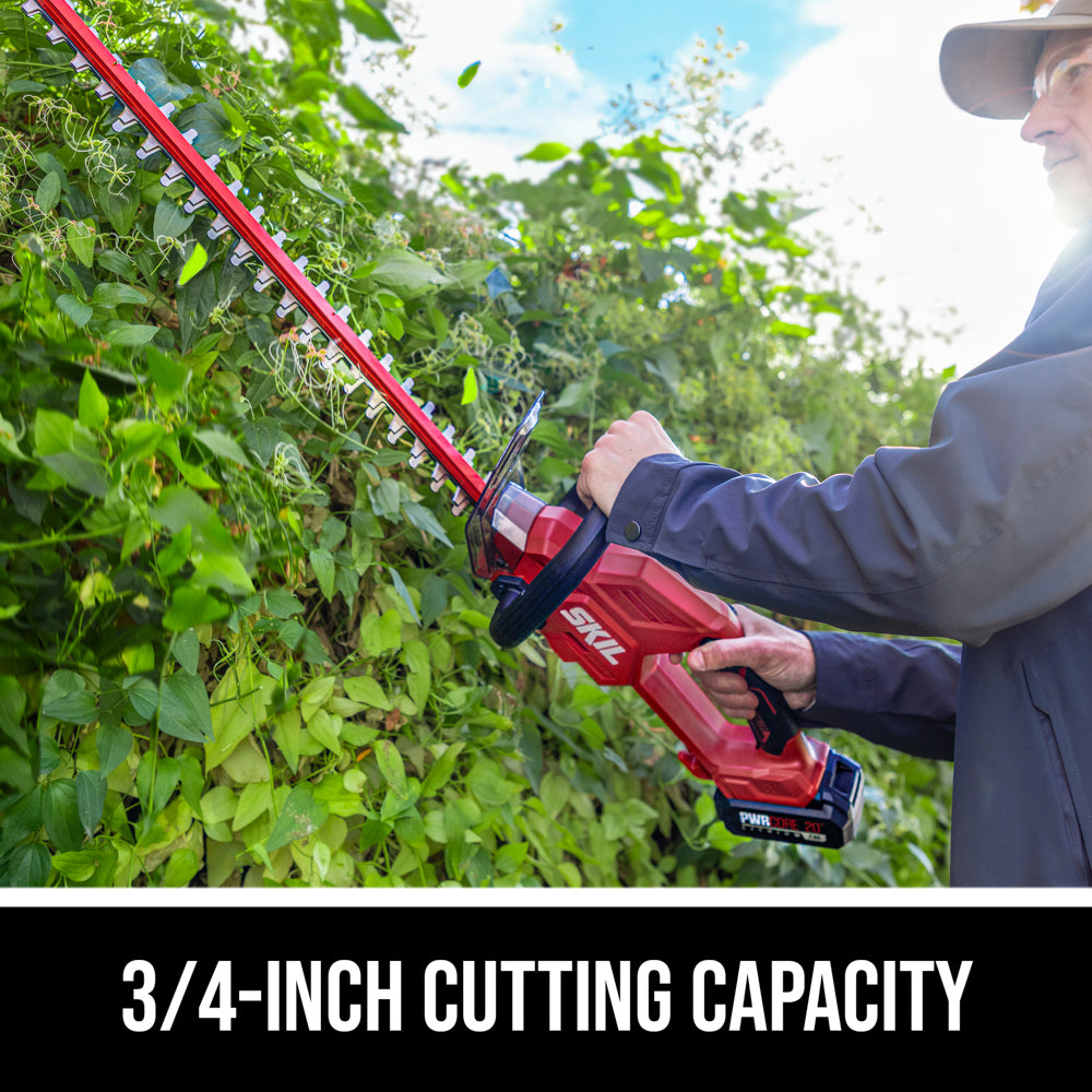 Trim and shape hedges, bushes, and shrubs with cordless convenience using the SKIL 20V Brushless 22 In. Hedge Trimmer. This cordless hedge trimmer features a brushless motor that delivers up to 3,000 SPM for fast, clean cuts while its ¾-inch cutting capacity allows you to cut through leaves and thick branches with ease. Dual-action hardened steel blades offer precise and clean cuts, and the debris remover collects and directs clippings away from the cutting area as you work. An included EASYSTORAGE bracket allows you to store and organize your SKIL outdoor power equipment quickly and easily. The kit includes the cordless electric hedge trimmer, 20V 2.0Ah battery, 20V 60W charger, debris remover, blade sheath, and EASYSTORAGE bracket.