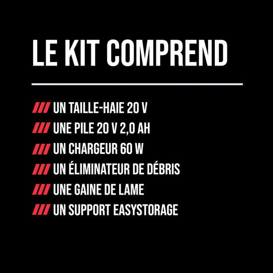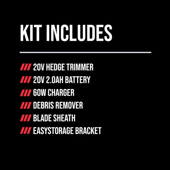 - CORDLESS HEDGE TRIMMER KIT - Includes the 20V hedge trimmer, 20V 2.0Ah battery, 20V 60W charger, debris remover, blade sheath, and EASYSTORAGE bracket