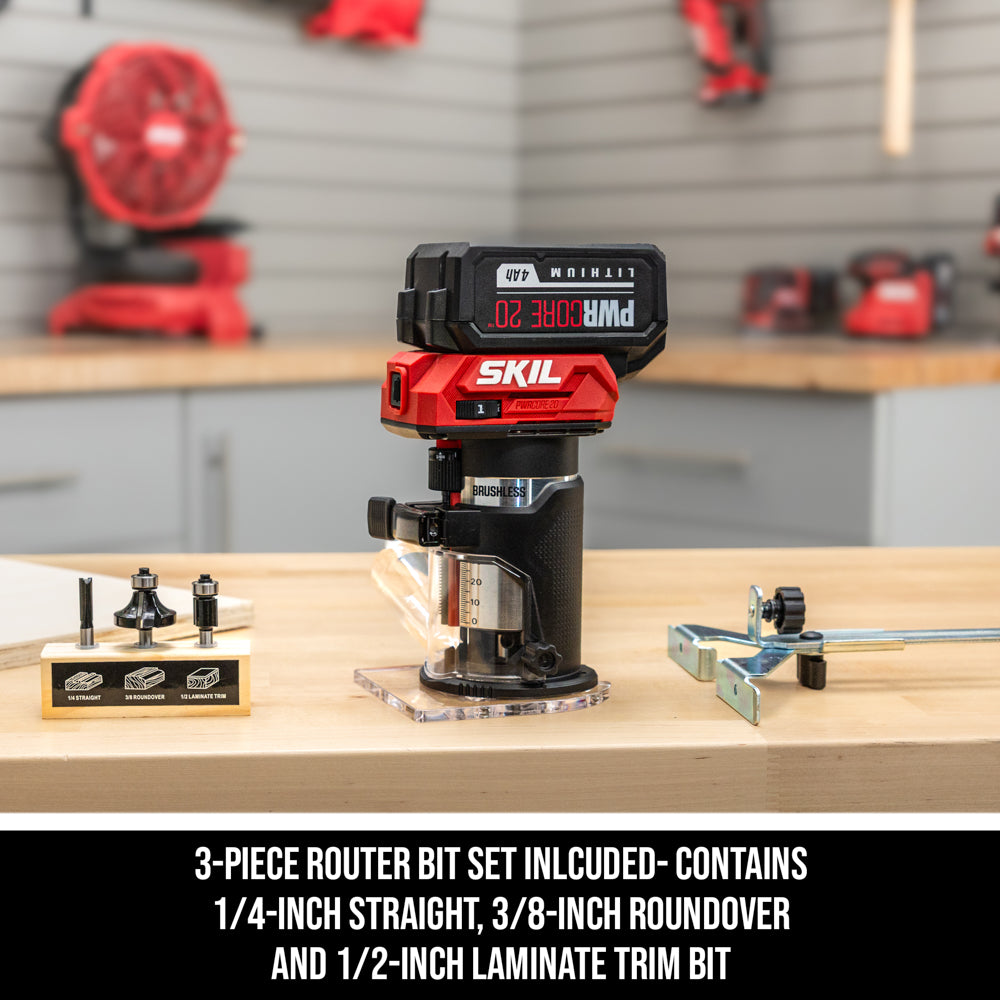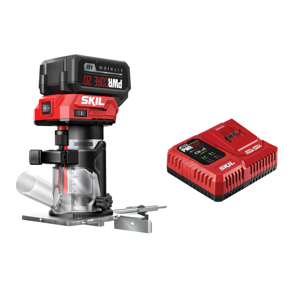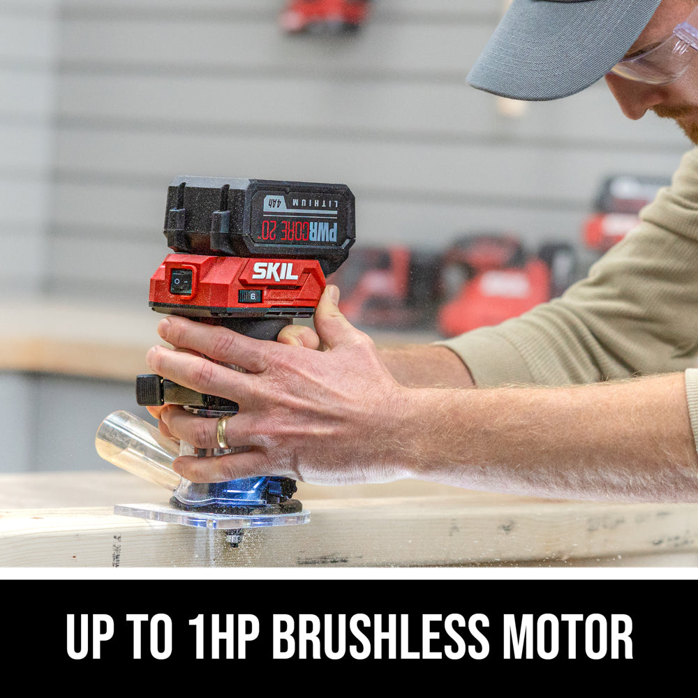 Shave smooth edges for furniture, shelves, and cabinetry projects or cut an indentation for a new door striker plate with the SKIL 20V Brushless Compact Router. The cordless compact router features a powerful brushless motor that delivers up to 1 HP, and it will cut up to 260 feet of pine with the included 20V 4.0Ah battery using the 3/8-inch roundover bit for extended runtime. Its compact, ergonomic design provides maximum comfort with a variable speed dial for precise control. Make quick, accurate depth adjustments with the quick depth adjustment dial and enjoy enhanced edge control with quick and easy adjustments with the edge guide’s patent pending design. The battery-powered router features soft starts to prevent damage to your woodworking project along with an LED light for improved visibility in dark work areas. This cordless router includes a bonus 3-piece router bit set complete with a ¼-inch straight, 3/8-inch roundover, and ½-inch laminate trim bit for a variety of projects. The compact router kit includes the 20V router, 4.0Ah battery, 60W charger, spanner, edge guide, dust shroud, and three-piece router bit set.