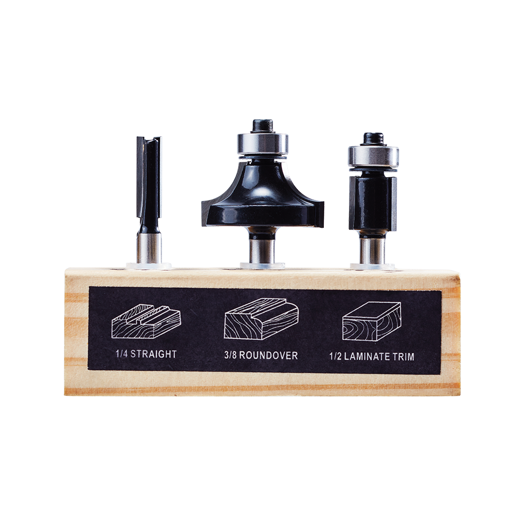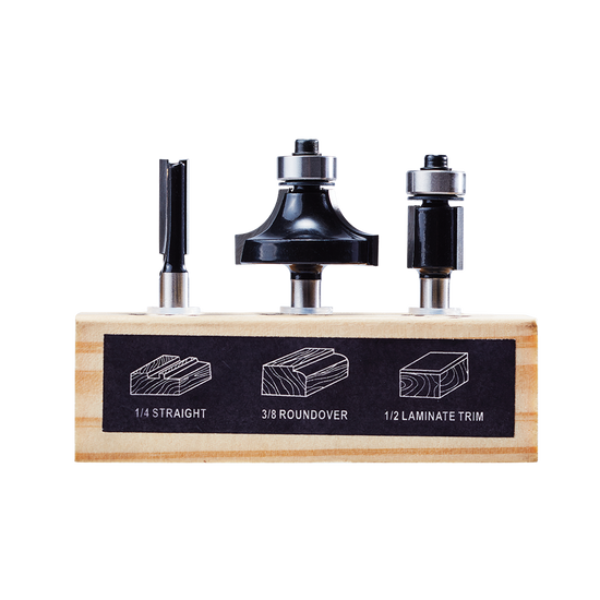 - 3pc Router Bit Set: (1) 1/4 in. Straight, (1) 3/8 in. Roundover, (1) 1/2 in. Laminate Trim