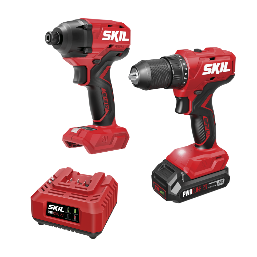 What's included: (1) SKIL PWRCORE 20™ Brushless 20V 1/2 In. Drill Driver [DL6280B-00], (1) SKIL PWRCORE 20™ Brushless 20V 1/4 In. Hex Impact Driver [ID6720B-00], (1) SKIL 20V Standard Charger [SC535801], (1) SKIL 20V 2.0Ah PWRCORE 20™ Lithium Battery [BY519701], (1) 2 in. Double End PH2 Bit, (1) 2 in. PH2 Bit
