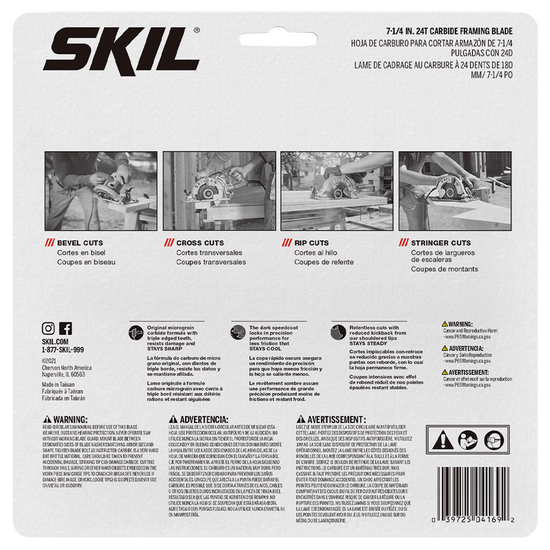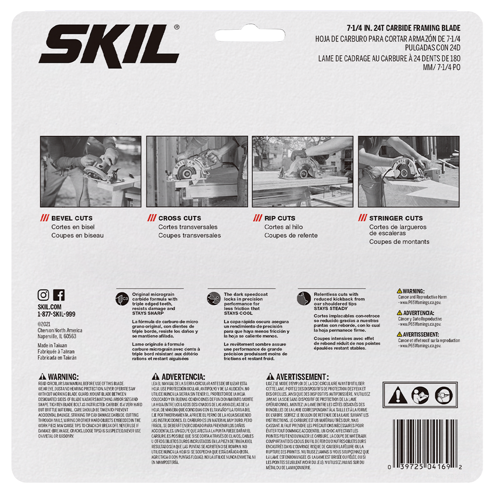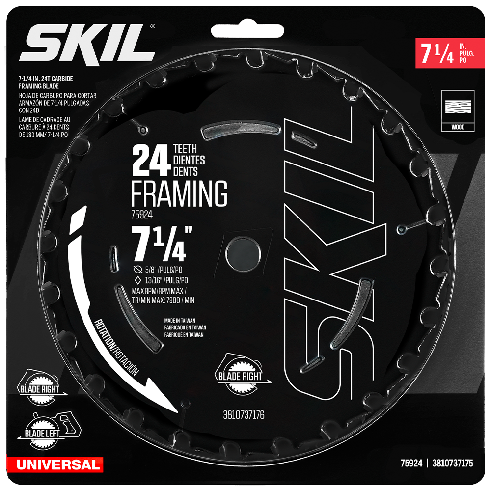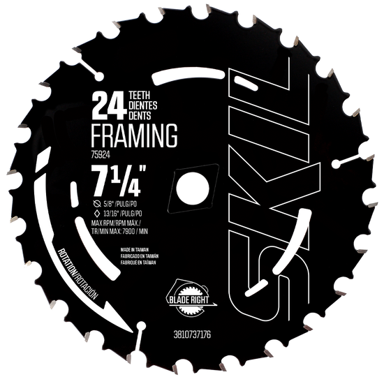 Make quick and clean rips, crosscuts, bevels, and stringers with the SKIL XP Black 7-1/4 In. 24-Tooth Carbide Framing Blade. This circular saw blade features SKIL’s original micrograin carbide formula, one of the hardest on the market, that resists damage from unexpected impacts to keep teeth sharper, longer. The saw blade has titanium carbide teeth that are 3X sharper for faster cuts and 10X more durable than standard carbide circular saw blades for longer life. A dark speedcoat delivers better performance and precision by reducing friction so the blade stays cooler when making long cuts while expansion slots reduce vibration to ensure the blade runs straight and true. Control cut shoulders limit the amount of material this 7 ¼-inch circular saw blade cuts to allow straight and accurate cutting with reduced kickback. A thin kerf gets this SKIL saw blade spinning faster, easier for optimal performance with either cordless or coded saws.