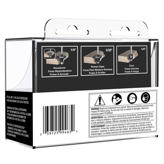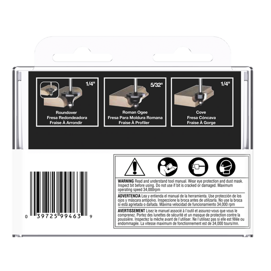- Includes: (1) 1/4-inch roundover bit, (1) 1/4-inch cove bit, and (1) 5/32-inch with bonus hex key, (1) 1/2-inch replacement bearing