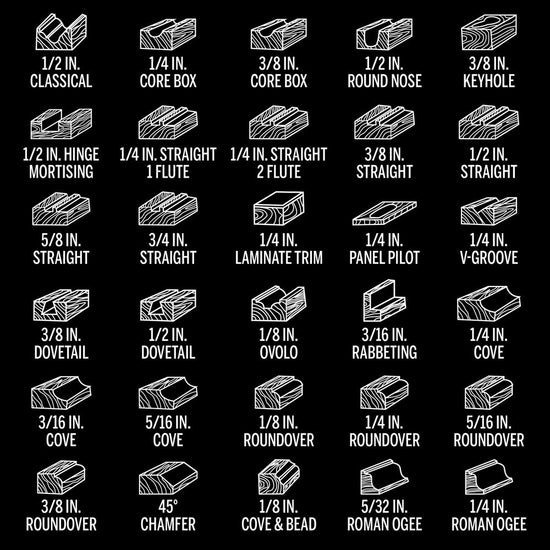 What's included: [6] straight: 1/4" (1-flute), 1/4" (2-flute), 3/4", 1/2", 5/8", 3/4", [1] hinge mortising: 1/2", [1] panel pilot: 1/4", [1] v-groove: 1/4", [2] corebox: 1/4", 3/8", [1] round nose: 1/2", [1] classical: 1/2", [1] ovolo: 1/8", [2] dovetail: 3/8", 1/2", [1] keyhole: 3/8", [1] laminate trim: 1/4", [4] roundover: 1/8", 1/4", 5/16", 3/8", [3] cove: 3/16", 1/4", 5/16", [2] roman ogee: 5/32", 1/4", [1] cove & bead: 1/8", [1] chamfer: 45°, [1] rabbeting: 3/16", [1] Hex key, [2] Replacement bearing: 3/8"