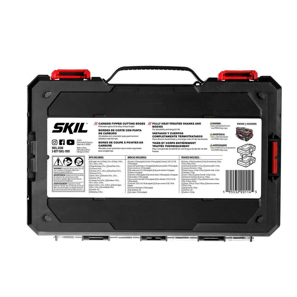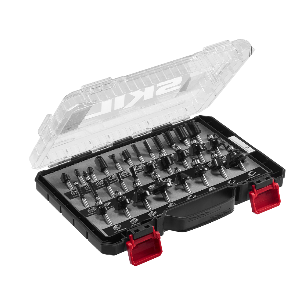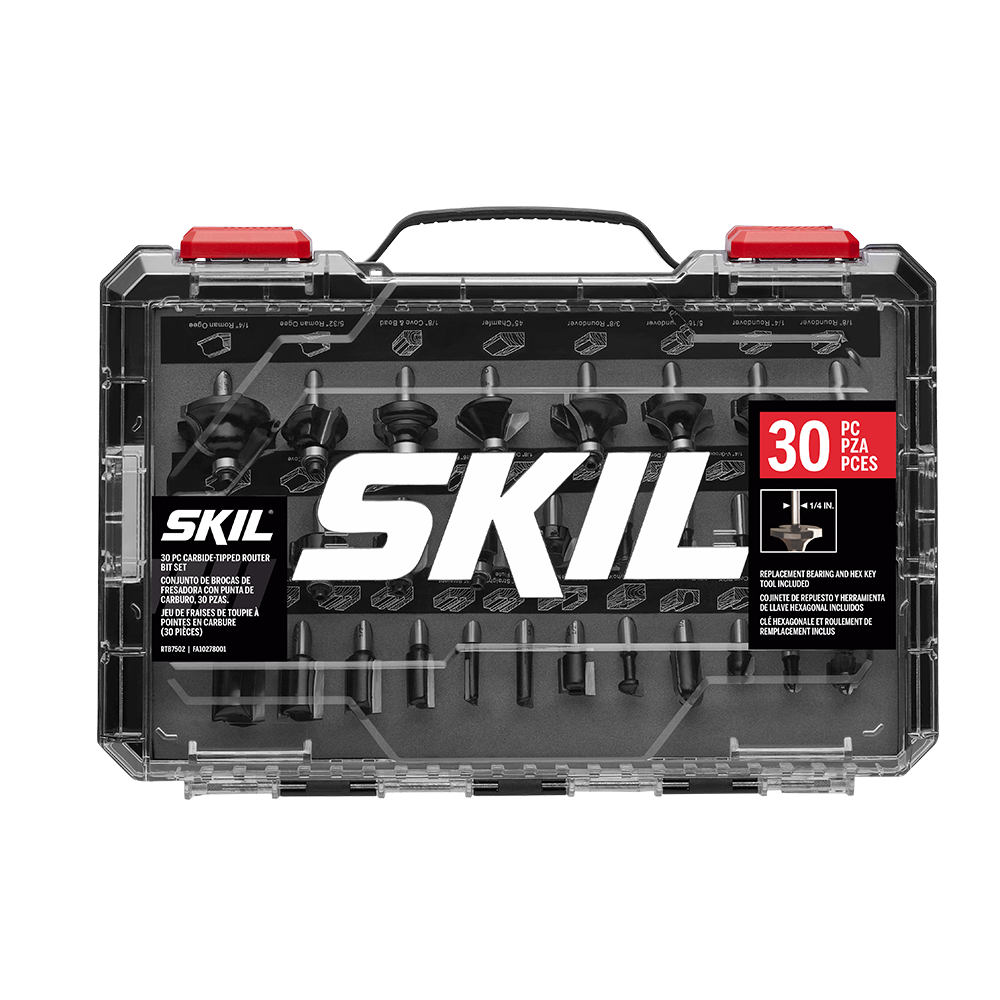 The SKIL 30 Pc. Carbide-Tipped Router Bit Set contains 30 commonly used router bits with precision-ground carbide-tipped cutting edges that stay sharp longer. The bits feature fully heat-treated shanks and bodies for durability and long bit life. All bits feature ¼-inch bit shanks and a controlled depth of cut that minimizes kickback. They’re compatible with routers mounted to a router table as well as handheld routers that accept ¼-inch shank router bits. The set comes packaged in an interlocking case that features a clear lid for easy identification, easy bit removal, and compatibility with other SKIL accessory cases for custom configurations. Router bits in the set include 1/4” single-flute, 1/4" dual-flute, 3/8”, 1/2”, 5/8”, 3/4” Straight; 1/2” Hinge Mortising; 1/4” Panel Pilot; 1/4” V-Groove; 1/4”, 3/8” Corebox; 1/2” Round Nose; 1/2” Classical; 1/8” Ovolo; 3/8”, 1/2” Dovetail; 3/8” Keyhole; 1/4” Laminate Trim; 1/8”, 1/4”, 5/16”, 3/8” Roundover; 3/16”, 1/4”, 5/16” Cove; 5/32”, 1/4” Roman Ogee; 1/8” Cove & Bead; 45° Chamfer; and 3/16” Rabbeting router bits.