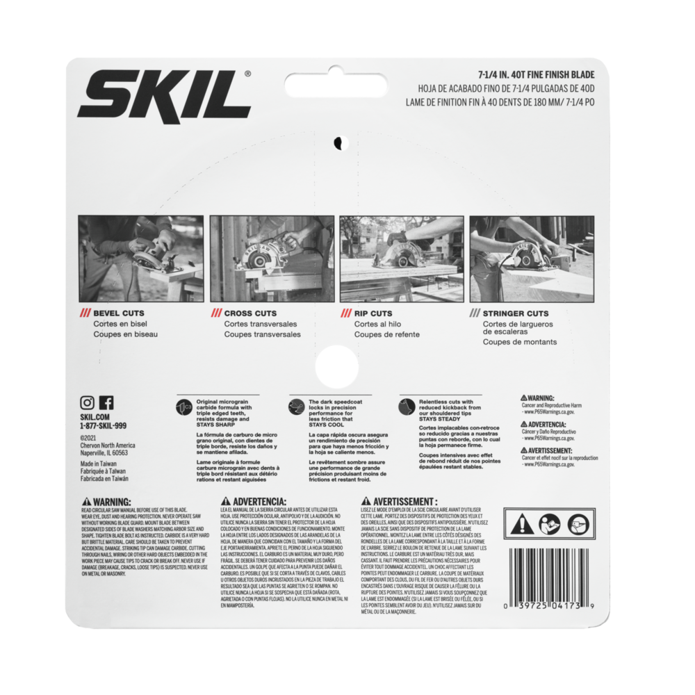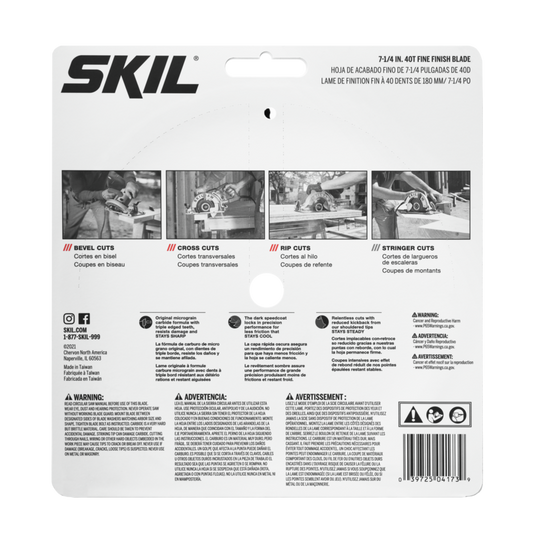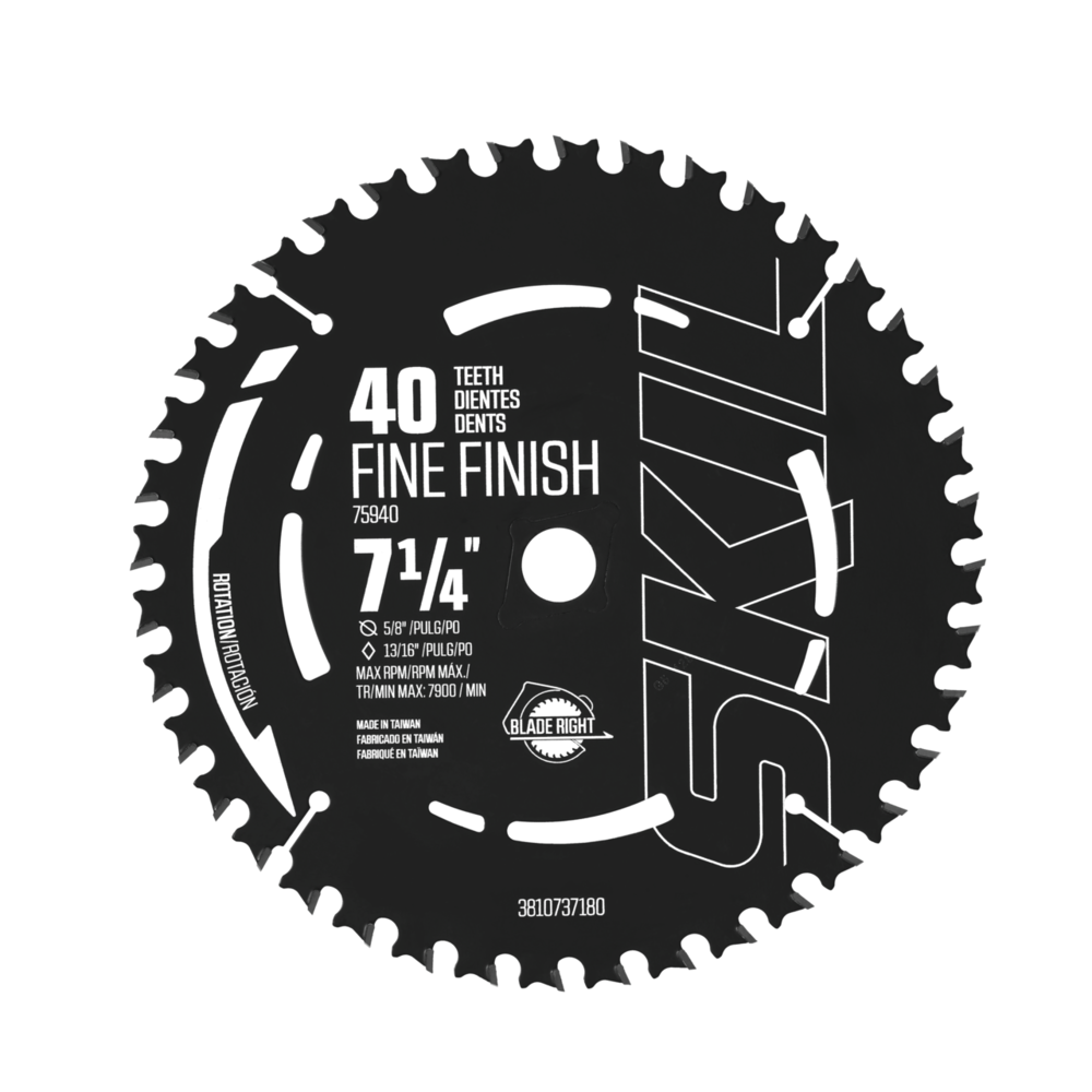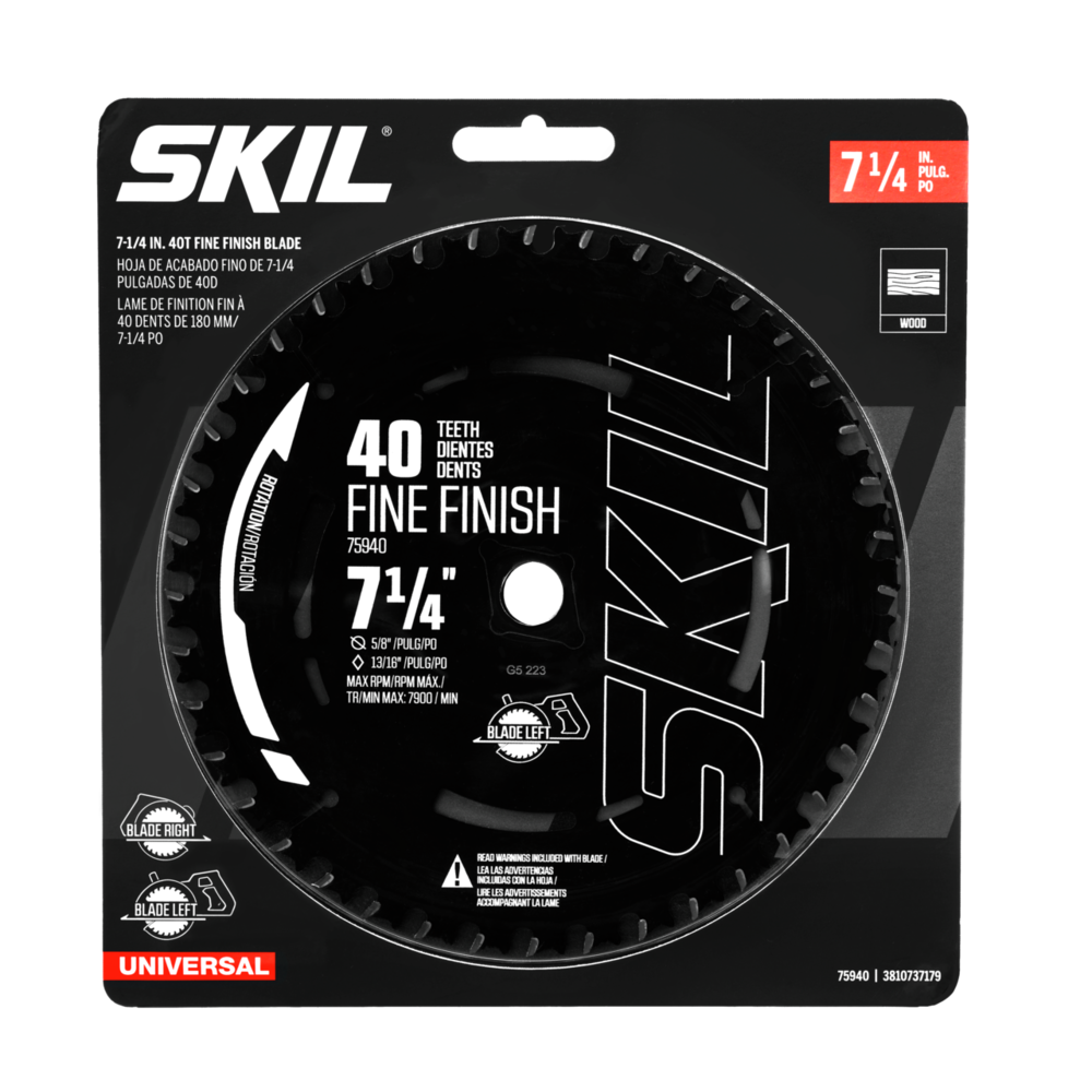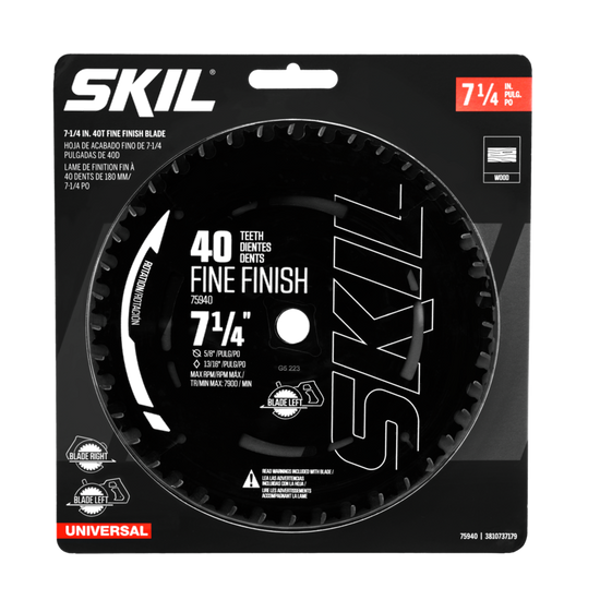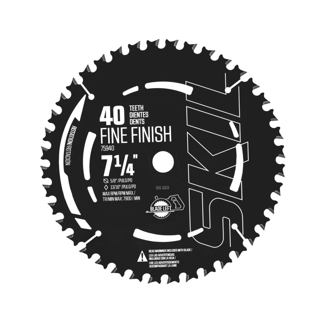 This SKILSAW® blade is triple sharp for smooth cuts and excellent finish. Control cut shoulders reduce kickback, while the Micrograin carbide stays sharper, resists impact damage for longer blade life. There's less friction and pitch buildup for fast effortless cutting with its speed coat finish. Thin kerf makes for faster cuts and less waste, but the extra hard steel plate resists bending and deflection.