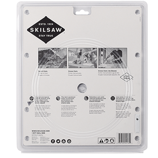 This SKILSAW® blade is triple sharp for smooth cuts and excellent finish. Control cut shoulders reduce kickback, while the Micrograin carbide stays sharper, resists impact damage for longer blade life. There's less friction and pitch buildup for fast effortless cutting with its speed coat finish. Thin kerf makes for faster cuts and less waste, but the extra hard steel plate resists bending and deflection.