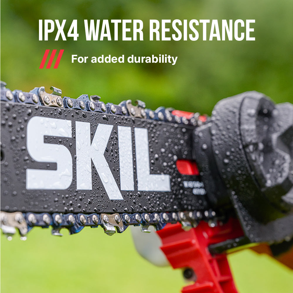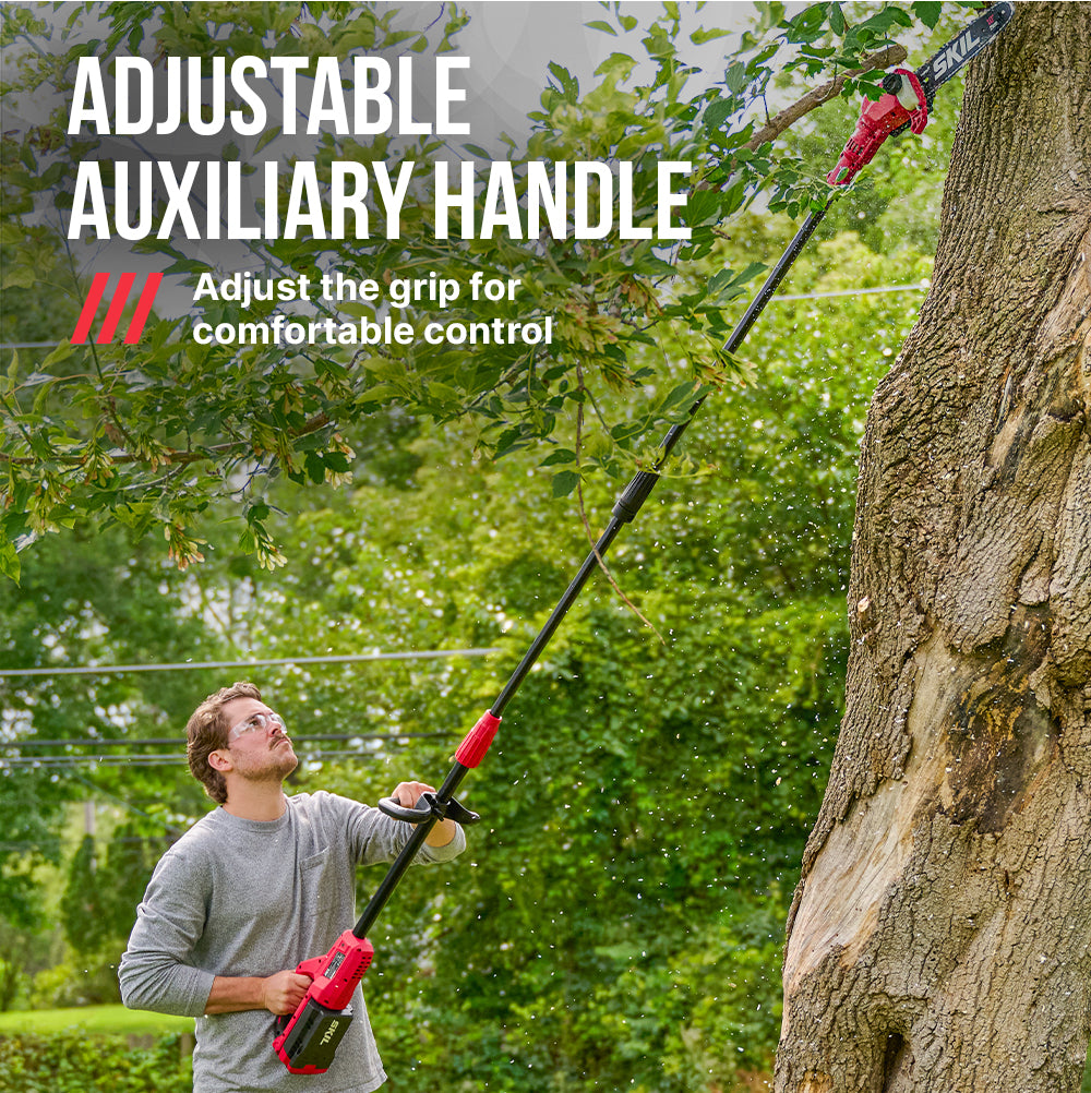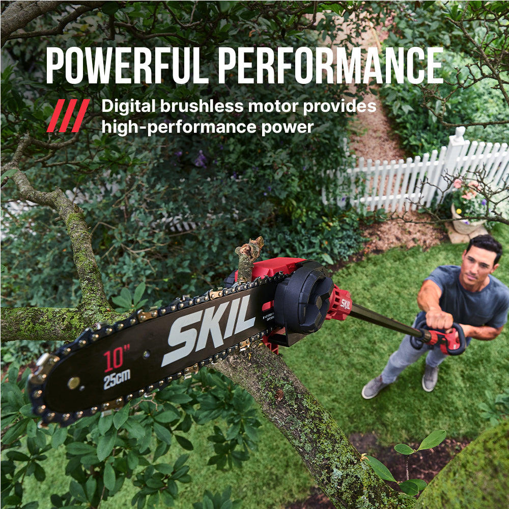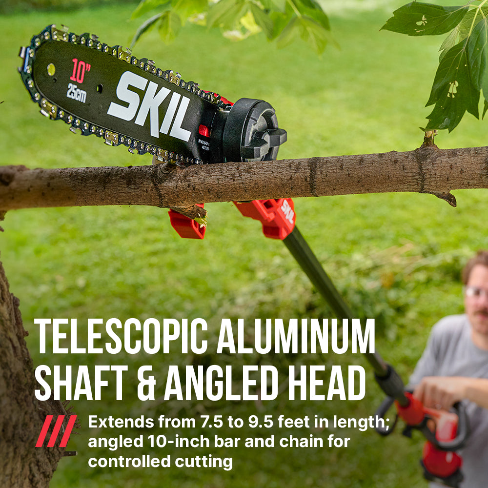 Add cutting reach and durability to your tool shed with the SKIL 40V Brushless 10 In. Pole Saw. The cordless electric pole saw features a digital brushless motor that delivers efficient, high-performance power without the hassle of gas. Its lightweight telescopic aluminum shaft extends from 7.5 to 9.5 feet for extended reach, making it an ideal choice among pole saws for tree trimming. Its angled 10-inch bar and auto-lubricating chain delivers versatile, controlled cutting with a 7.5-inch cut capacity while its adjustable auxiliary handle lets you dial in your preferred grip for even more control when cutting overhead. Tighten the chain on the tree trimmer with the twist of a dial for hassle-free adjustments between cuts. The battery pole saw kit includes the 40V pole saw, 2.0Ah battery, and 60W charger.