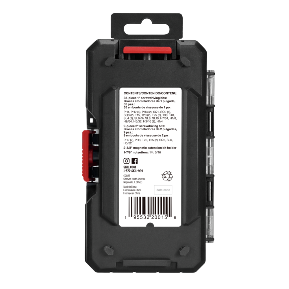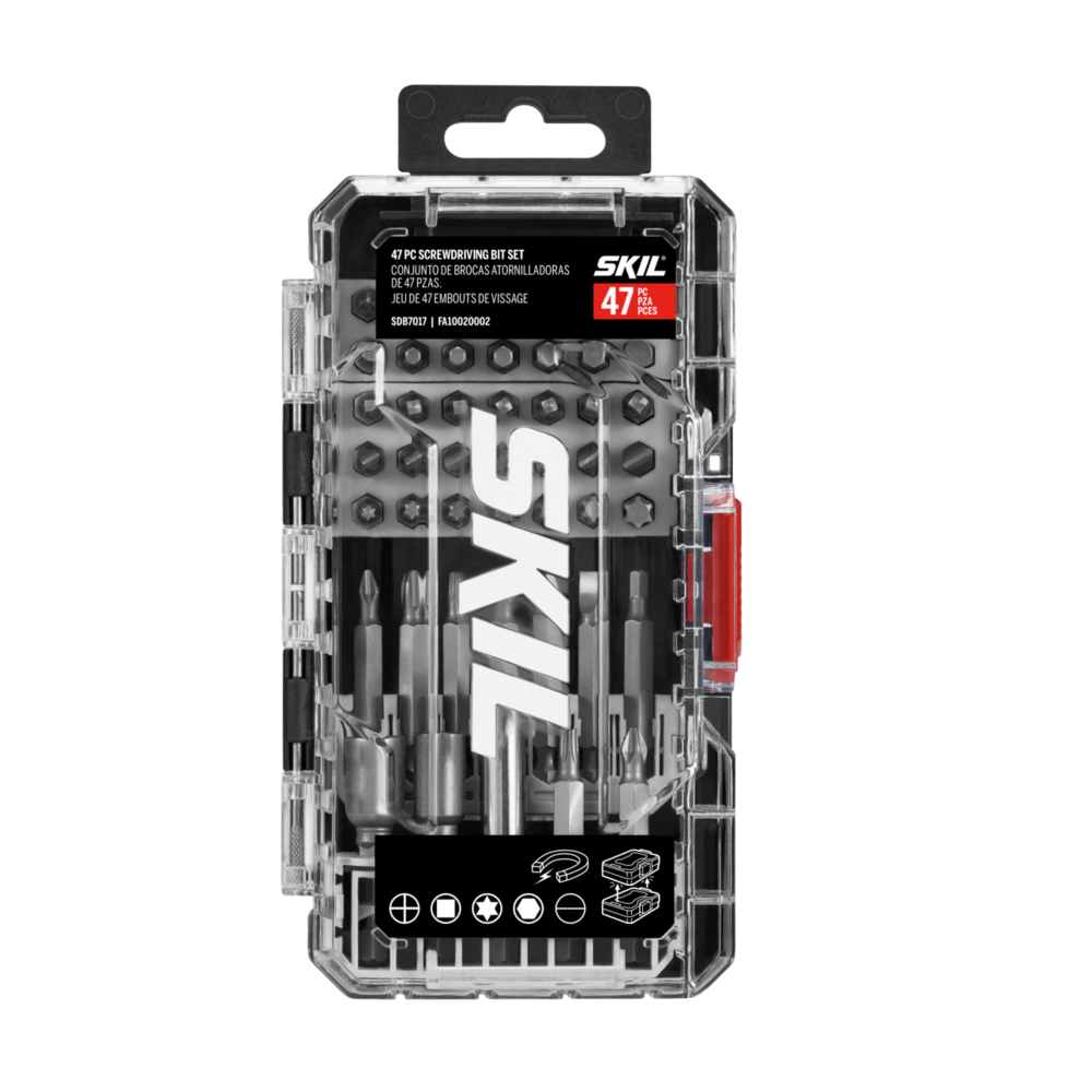The SKIL 47-Piece Screwdriving Bit Set delivers an assortment of the most commonly used screw driving bits for a variety of projects that require driving bits into wood, plastic, and metal. The bit kit includes 35 1-inch bits, 9 2-inch bits, two 1-7/8-inch nut setters, and a 2-3/8-inch magnetic extension bit holder for extra reach. Removable inserts allow you to customize your bit organization within the case. The screwdriver bit set comes in an interlocking case featuring a clear lid for easy bit identification, easy screwdriver bit removal, and compatibility with other SKIL accessory cases for custom configurations.