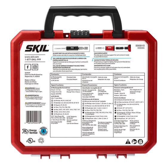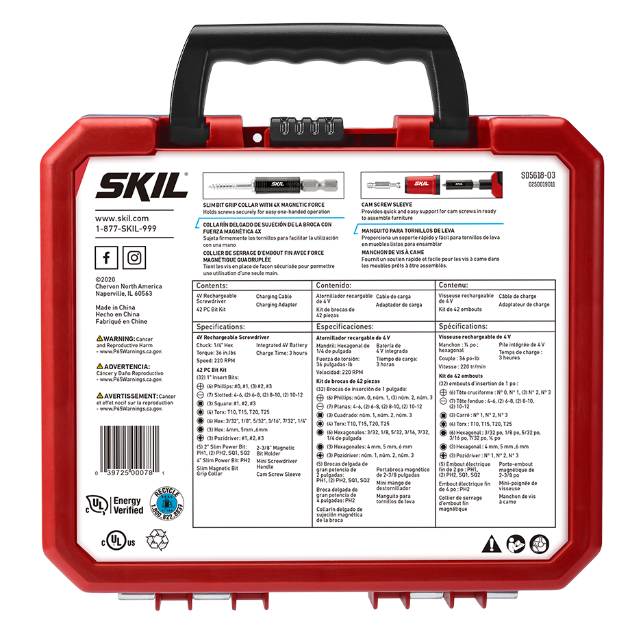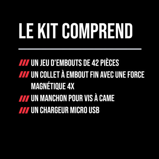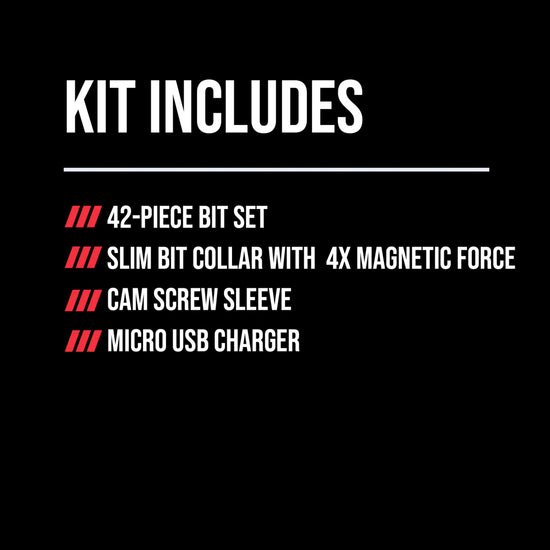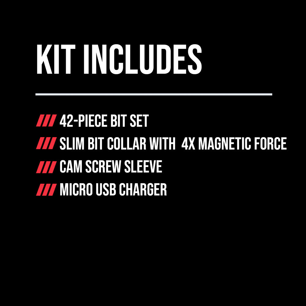 - Includes 42-Piece Bit Set, Slim Bit Collar with 4X Magnetic Force, Cam Screw Sleeve, and Micro USB Charger
