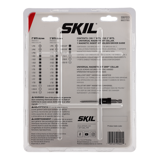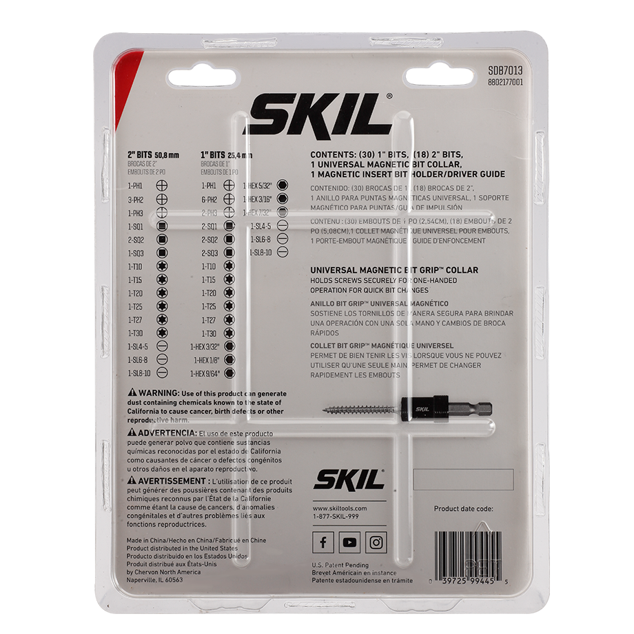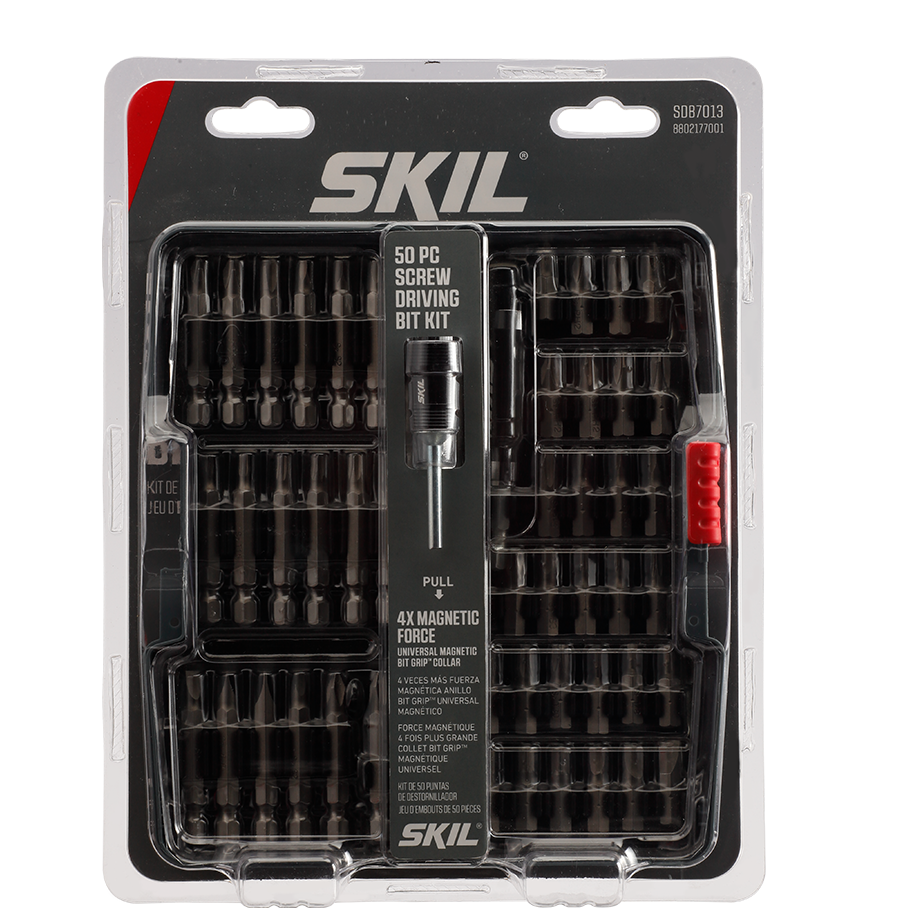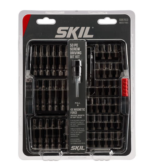 The SKIL 50-piece screwdriving bit set offers an assortment of the most commonly used screw driving bits for a variety or projects. Plus the patented, Bit Grip™ Magnetic Bit Collar holds screws securely for one-handed use. Simply slide the collar onto a 2 IN. impact bit for 4X Magnetic Force to hold fasteners securely. Includes convenient carrying case to keep your bits organized and easy to access.