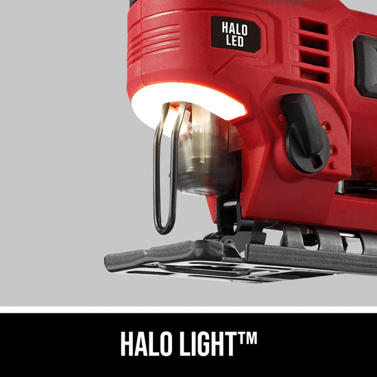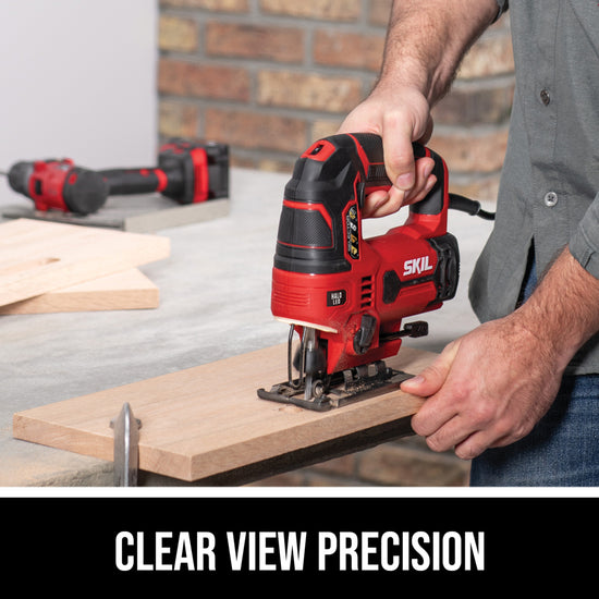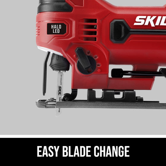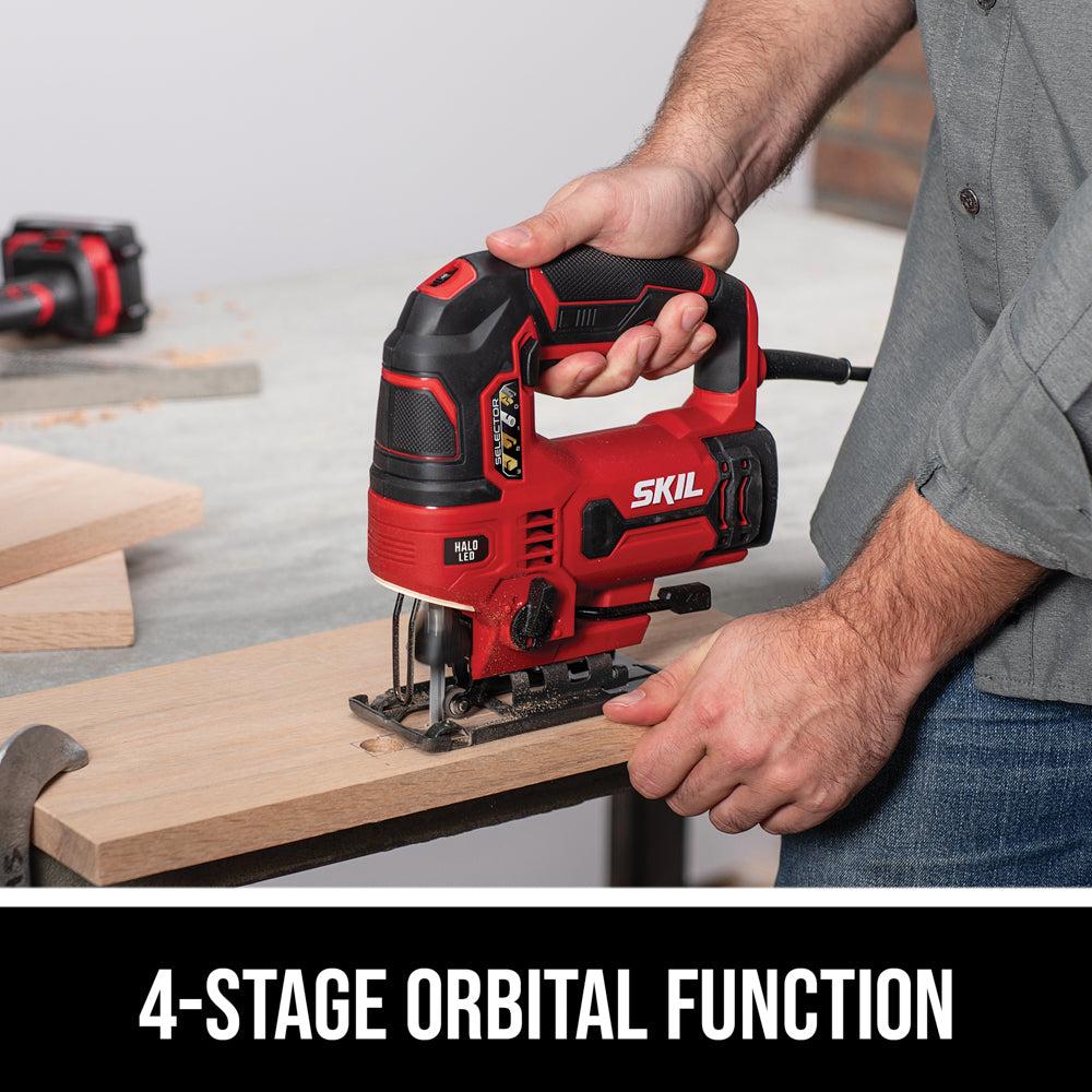 Precise and Packed with Features With features like the 4-Stage orbital function, speed control and dust blowing function allow the SKIL 6 Amp jigsaw to deliver precision on a wide range of applications. Tool-free blade changes, angled cutting and Halo Light set this jig saw ahead of the rest.