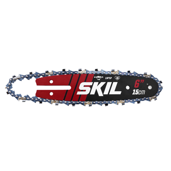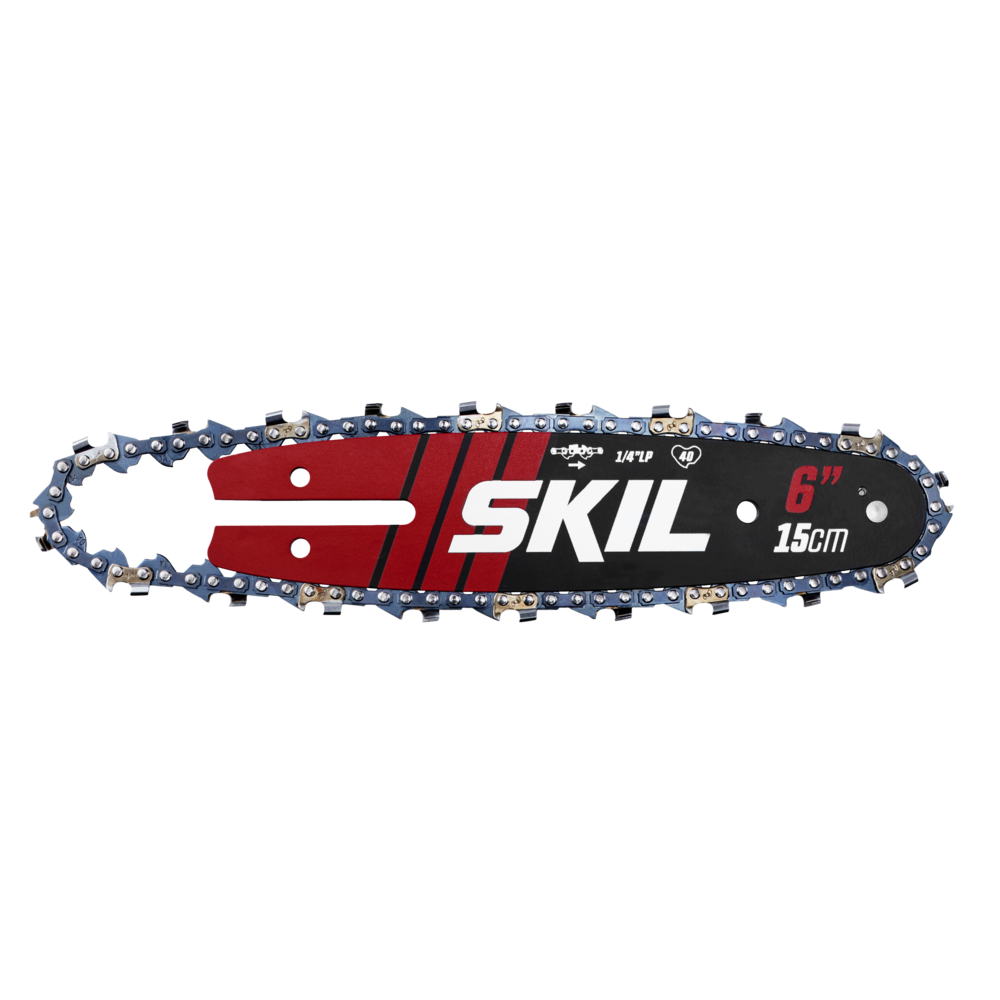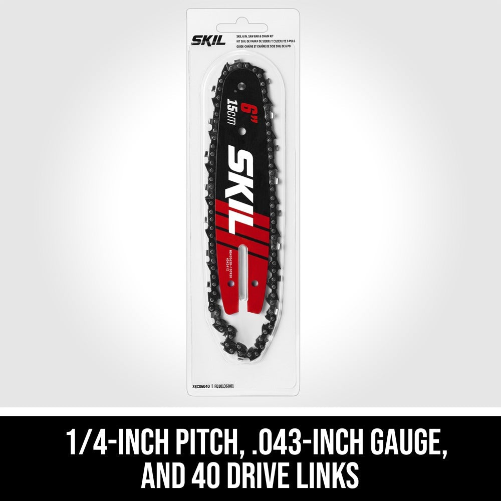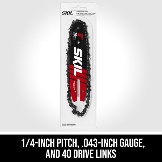 Keep your SKIL 6-inch saw performing at its best with the SKIL 6 In. Saw Bar & Chain Kit. This replacement saw bar chain & chain is compatible with all SKIL PWR CORE 20™ 6-inch saws like the 6 In. Pruning Saw (PR0600B) and 6 In. Telescoping Pruning Saw (PR0601B). The kit features a lightweight, reversible saw bar and 6-inch chain with a 1/4-inch pitch, .043-inch gauge, and 40 drive links. It has a low kickback design to help reduce kickback without impacting the performance of your cordless saw.