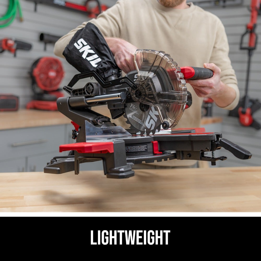Make exacting cuts for baseboards, casing, and crown moulding, or cut planks for shelves and bookcases using the SKIL 10 Amp 7-1/4 In. Single Bevel Sliding Miter Saw. The miter saw features an LED shadow line that delivers cuts with greater accuracy than lasers. Its quick miter lock delivers quick and accurate miter angle adjustments while its 10-amp motor powers up to 4,800 RPM for fast, detailed cuts. This single bevel miter saw features a lightweight design for easy transport and storage with a fixed compact rail system that minimizes the saw’s footprint for flush cutting against walls. Its single bevel allows cuts from 0 to 45 degrees left while its work clamp secures materials for safer cutting. The miter saw comes with a dust bag, double-ended Allen wrench, work clamp, and 7-1/4-inch 24T carbide blade.