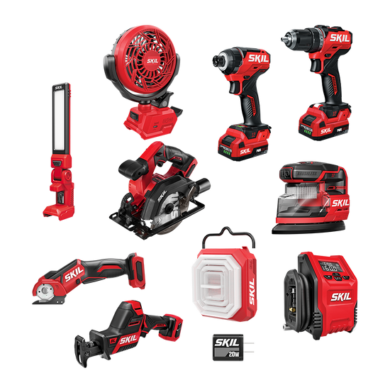 Take on projects with the everyday essentials you need with the SKIL 12V 10-Tool Combo Kit. The Brushless 12V 1/2-Inch Compact Drill Driver delivers up to 350 inch-pounds of torque to drive screws and drill pilot holes with precise control, with a 1/2-inch single-sleeve keyless chuck for quick and easy bit changes. Loosen large bolts, drive screws through thick surfaces, and take on the toughest materials with the Brushless 12V ¼-Inch Compact Hex Impact Driver’s 1,500 inch-pounds of torque. The 12V Compact Reciprocating Saw features a compact, high-performance brushless motor that makes this electric hand saw strong enough to cut through lumber, PVC piping, tree branches, and metal with an adjustable pivoting shoe for constant contact with work surfaces for smooth cuts and reduced vibration. The SKIL 12V Multi-Cutter slices through tough materials like carpet, cardboard, cloth, and leather with a self-sharpening blade that allows for interruption-free use. Finish the job with the SKIL Brushless 12V Compact Detail Sander, which delivers up to 12,000 OPM and features a transparent, integrated dust box that improves balance, visibility, and maneuverability while avoiding contact with the battery—and it can be easily emptied without tools. Light up your workspace with the 12V Mechanical Work Light, which emits up 600 lumens and is equipped with a 180° pivoting head with a 270° left/right swivel for enhanced versatility. Built for tight spaces and easy on-the-go use, the 12V/20V 4 In. Clamp Fan delivers powerful airflow up to 200 CFM with airspeeds up to 11 MPH with an industrial threaded clamp that provides strong holding capacity. The 12V/20V Collapsible Lantern delivers 360 degrees of illumination with up to 300 lumens, powered by either SKIL 12V or 20V batteries for convenience. The 12V Inflator can take on everything from bicycle and car tires to sports balls with a digital pressure gauge and high-pressure mode with auto shutoff for hands-free use. The two included 12V 2.0Ah USB-C batteries feature two-way rapid charging that allows you to charge the battery or portable devices with its 60W USB-C port. When it’s time to recharge the battery, the multifunctional charger ditches the traditional power tool charging dock for a compact, convenient format that can plug in anywhere. The cordless power tool combo kit includes a cordless drill driver, cordless impact driver, cordless circular saw, cordless reciprocating saw, cordless multi-cutter, cordless detail sander, cordless mechanical work light, cordless clamp fan, collapsible lantern, cordless inflator, (2) 12V 2.0Ah USB-C batteries, a 20W USB-C charger, and tool accessories.