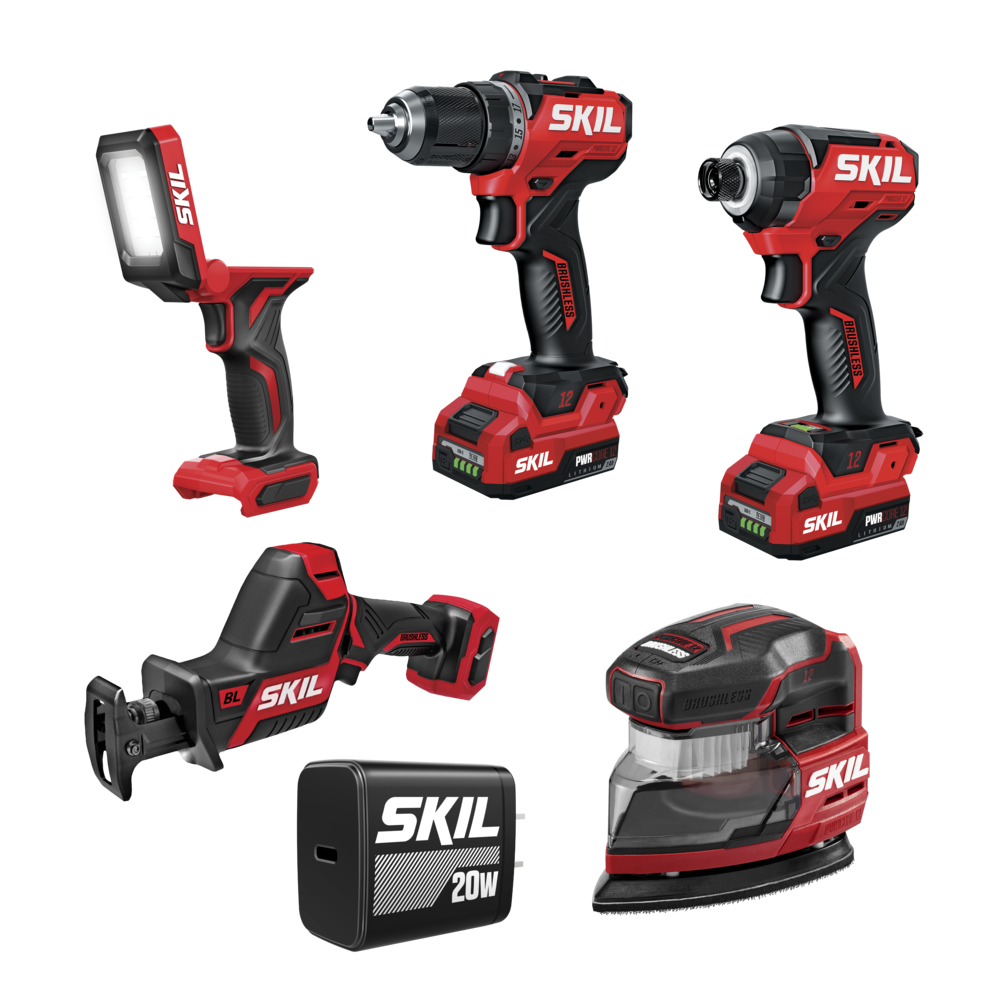 Take on common projects with the everyday essentials you need with the SKIL 12V 5-Tool Combo Kit. Drive screws and drill pilot holes with precise control with the Brushless 12V ½-Inch Drill Driver’s variable speed trigger and change bits quickly and easily with its ½-inch single-sleeve keyless chuck. Loosen large bolts, drive screws through thick surfaces, and take on the toughest materials with Brushless 12V ¼-Inch Hex Impact Driver’s 1,500 inch-pounds of torque. The 12V Compact Reciprocating Saw features a compact, high-performance brushless motor that makes this electric hand saw strong enough to cut through lumber, PVC piping, tree branches, and metal. Finish the job with the SKIL Brushless 12V Compact Detail Sander, which delivers up to 12,000 OPM and features a transparent, integrated dust box that improves balance, visibility, and maneuverability while avoiding contact with the battery—and it can be easily emptied without tools. Light up your workspace with 12V Area Light, which directs up to 400 lumens of light where you need it with its 120-degree pivoting head. This 12V combo tool kit includes the 12V drill driver, 12V impact driver, 12V reciprocating saw, 12V detail sander, 12V area light, (2) 12V 2.0Ah batteries with USB-C, 20W PD charger, (2) screwdriving bits, a belt clip, wood cutting blade, (5) 80-grit sandpapers, (5) 120-grit sandpapers, (5) 180-grit sandpapers, and (5) 240-grit sandpapers.