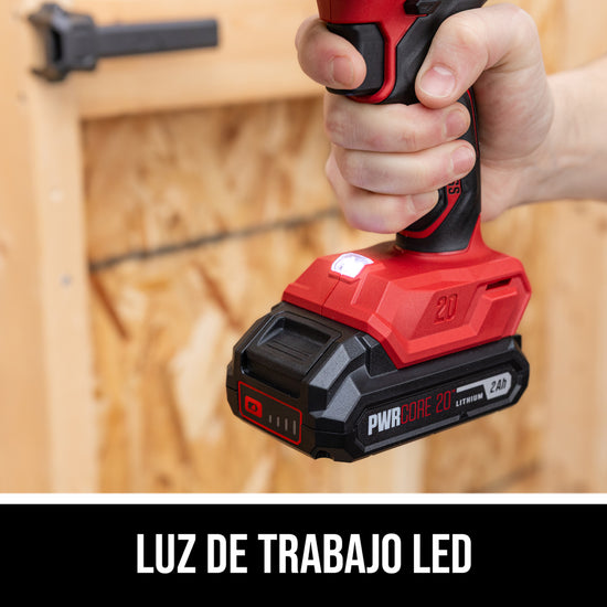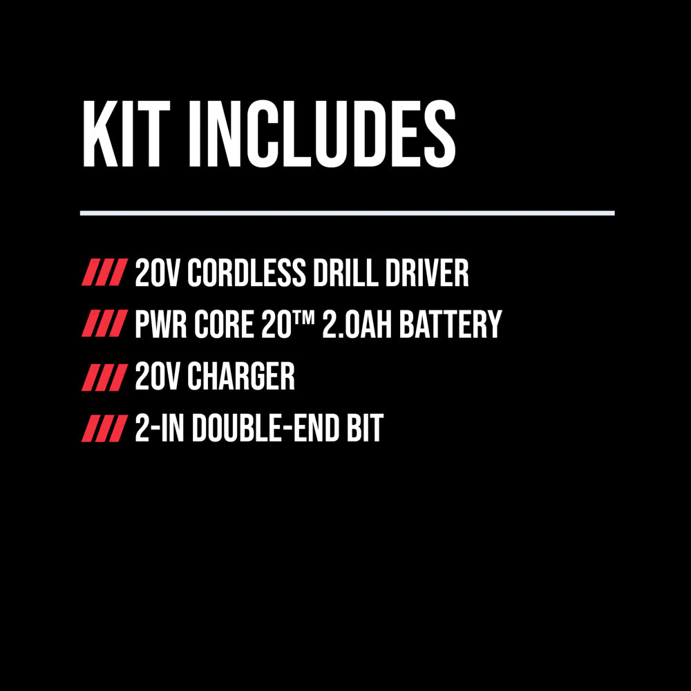 - 20V CORDLESS DRILL DRIVER KIT - Includes the 20V cordless drill driver, PWR CORE 20™ 2.0Ah battery, 20V charger, and 2-inch double-end bit