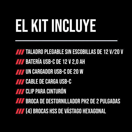 - 12V FLIP DRILL SET - Kit includes the 12V/20V brushless flip drill, 12V 2.0Ah USB-C battery, 20W USB-C charger, USB-C charging cable, belt clip, 2-inch PH2 screwdriving bit, and (4) hex shank HSS bits